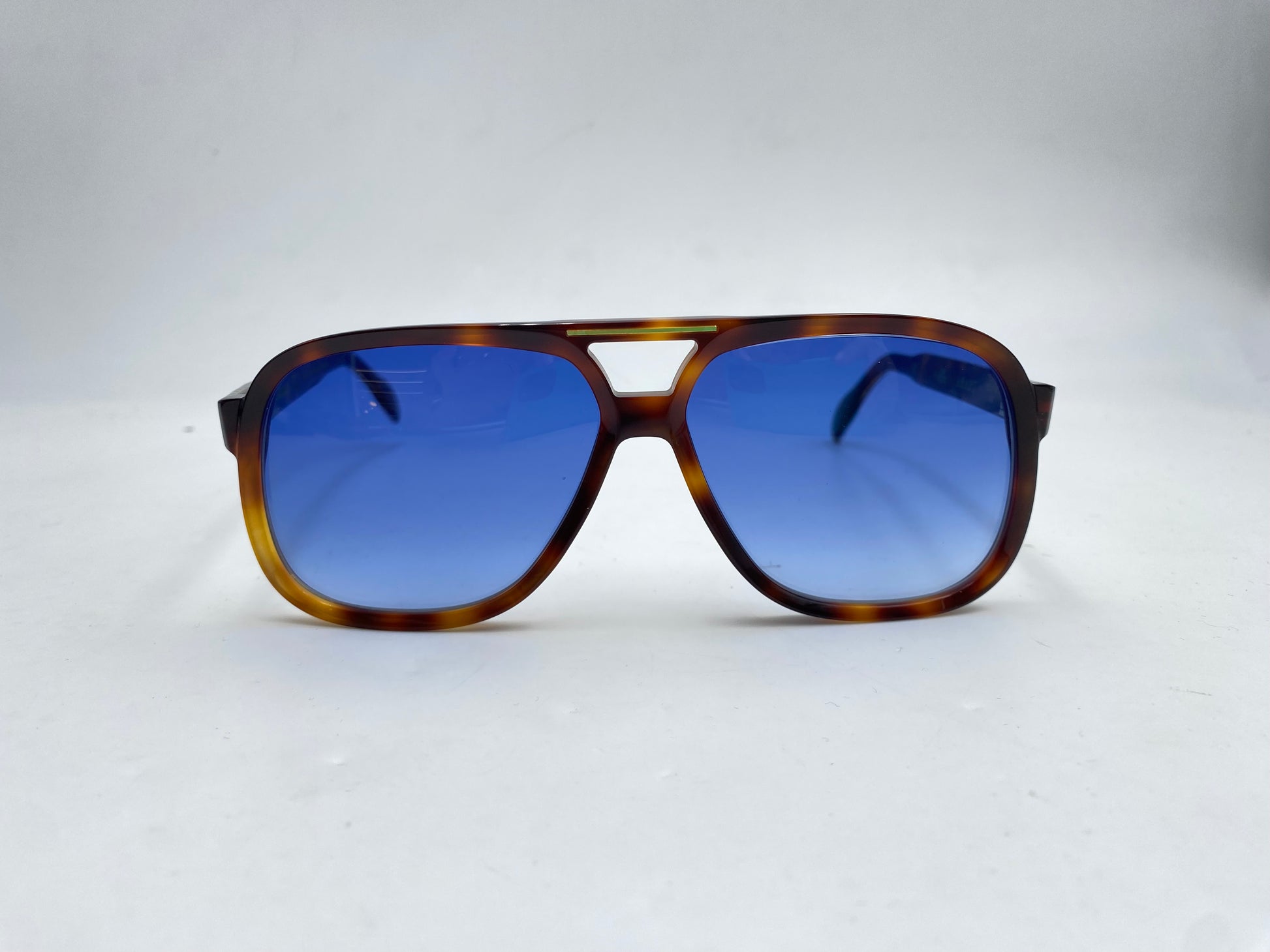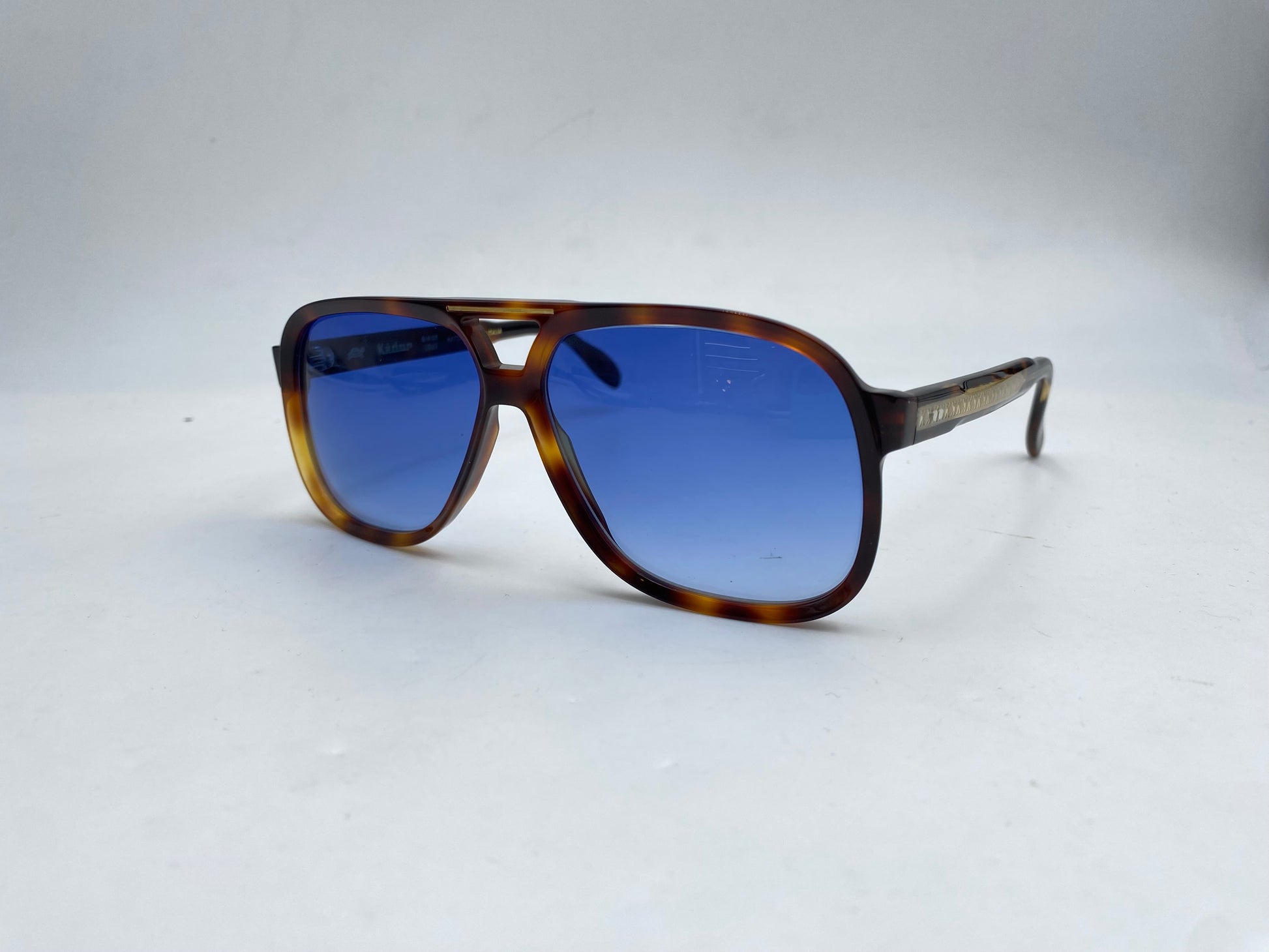 Occhiale da sole firmato Kador in acetato lucido tartarugato. Frontale aviator con doppio ponte e lenti azzurre sfumate. Aste sottili con anima in metallo dorato e classici naselli acetati.