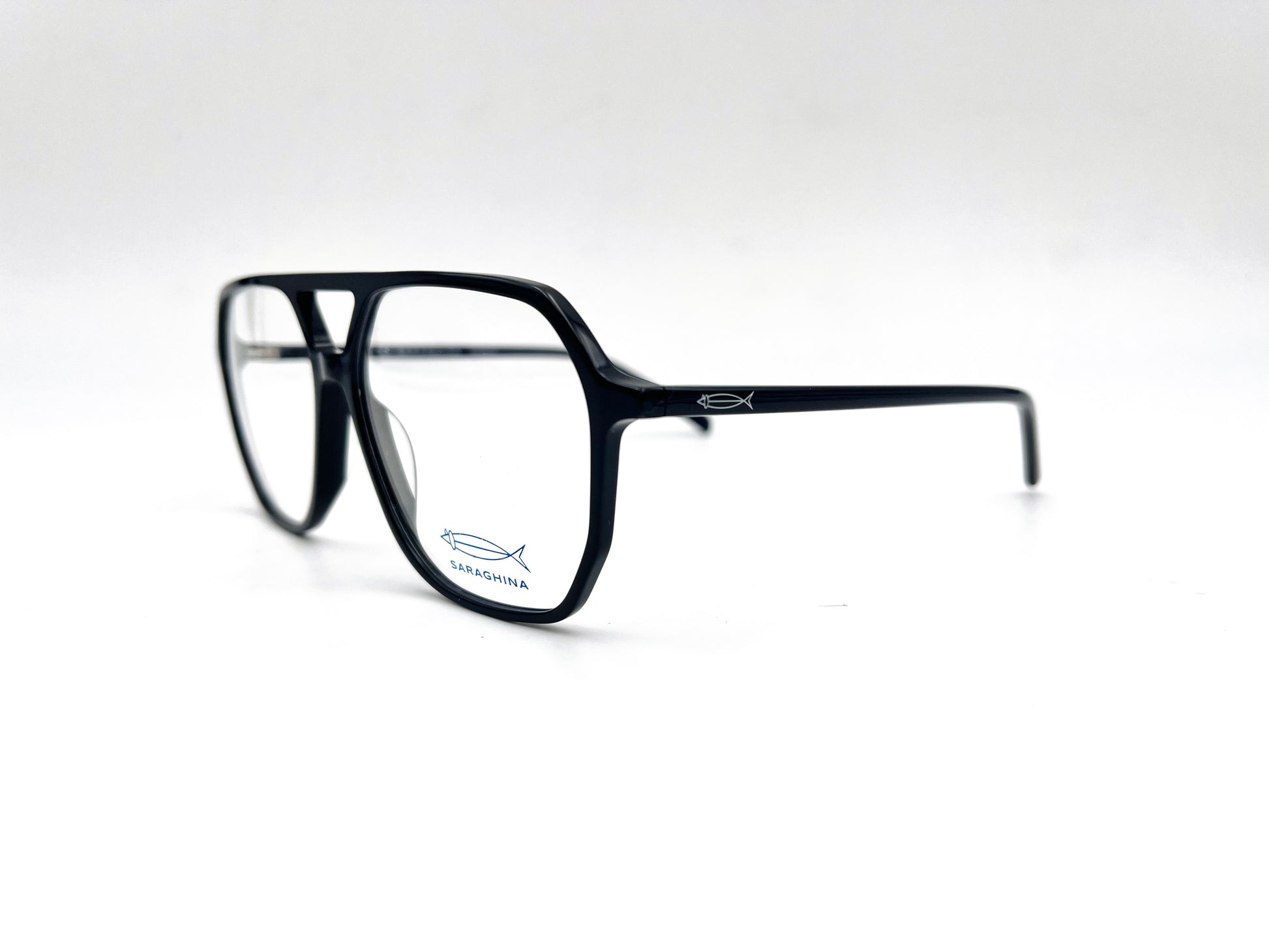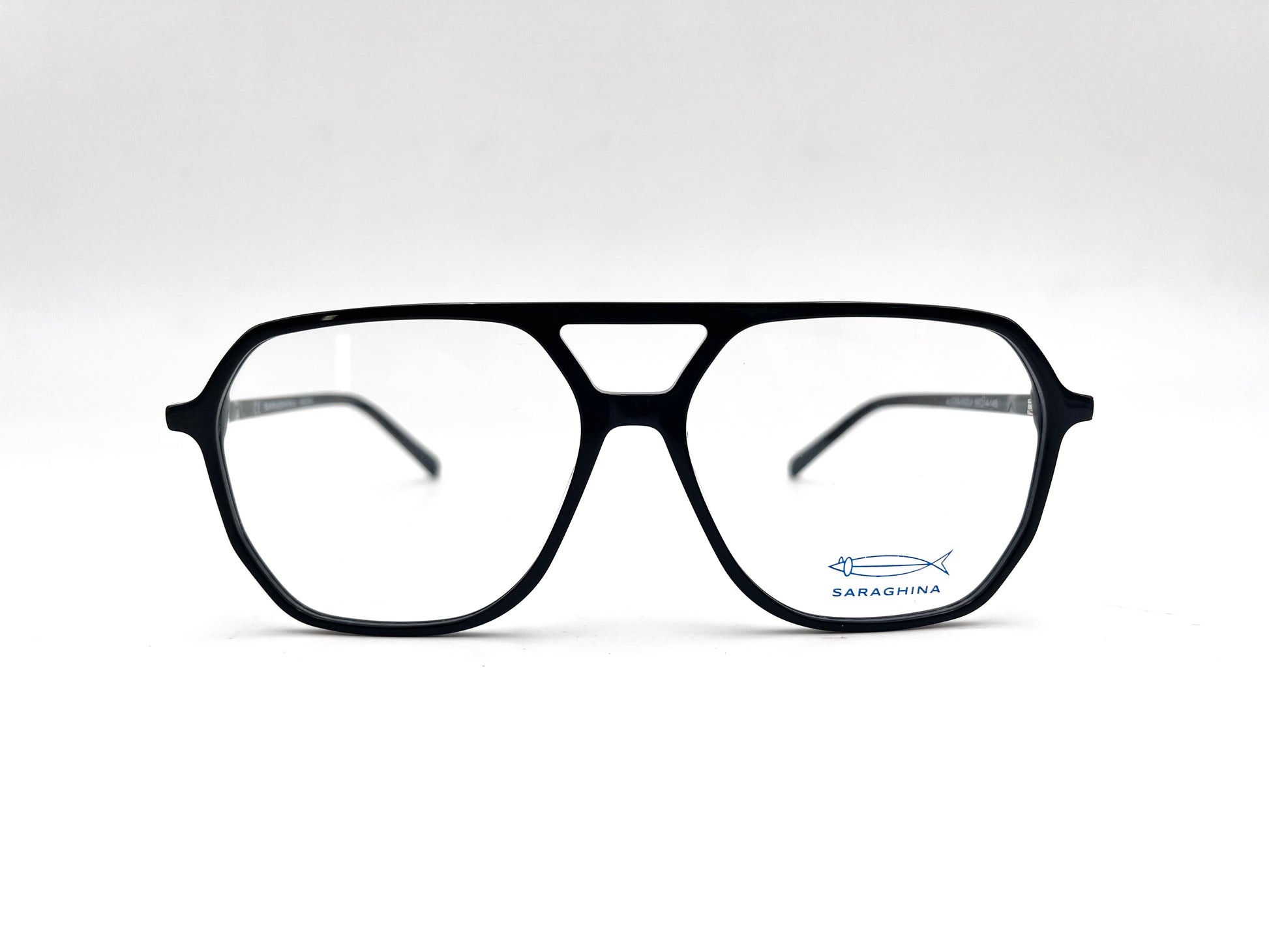 Montatura da vista Saraghina ultra sottile in acetato nero lucido. Frontale pilot con doppio ponte.