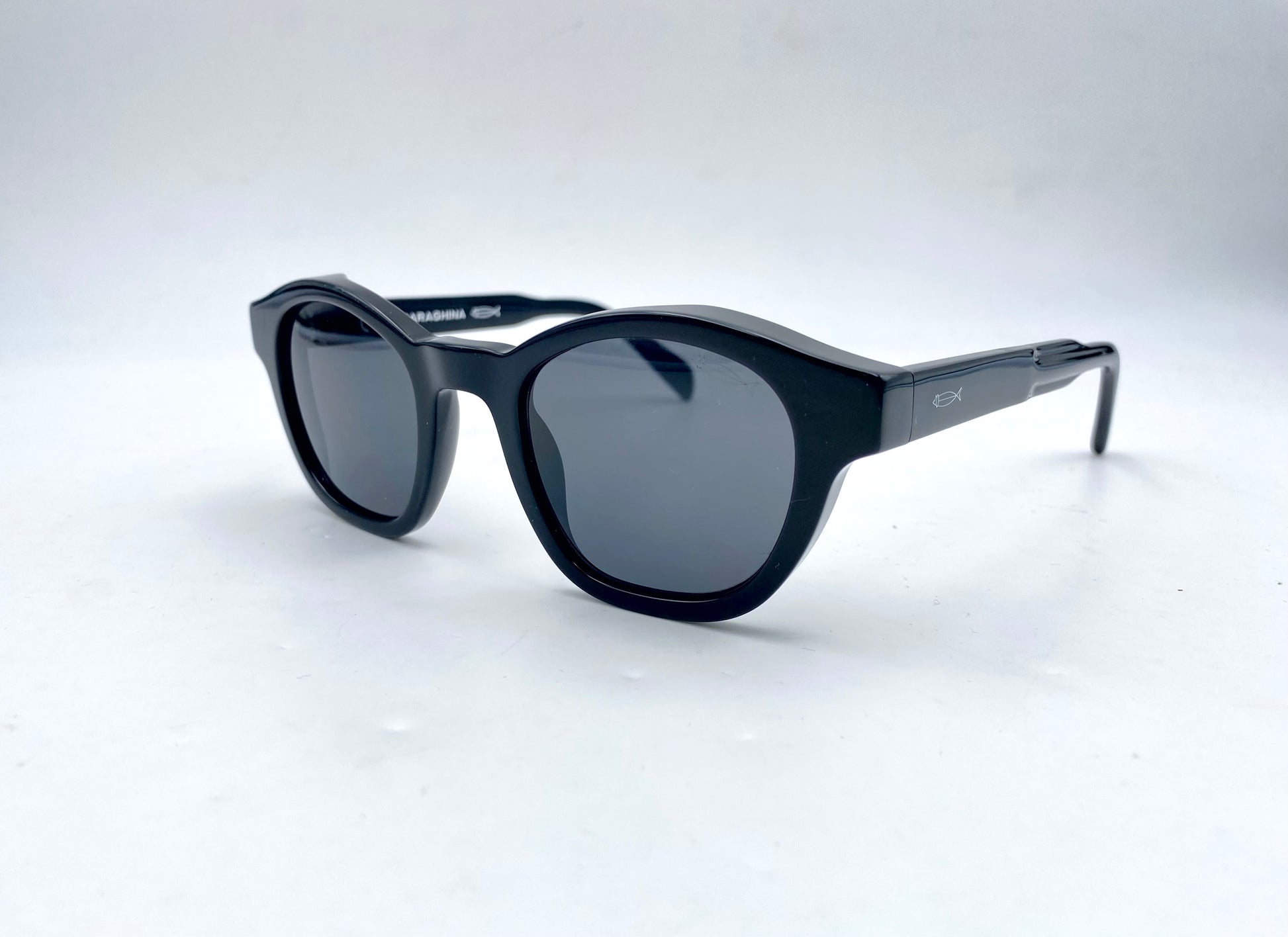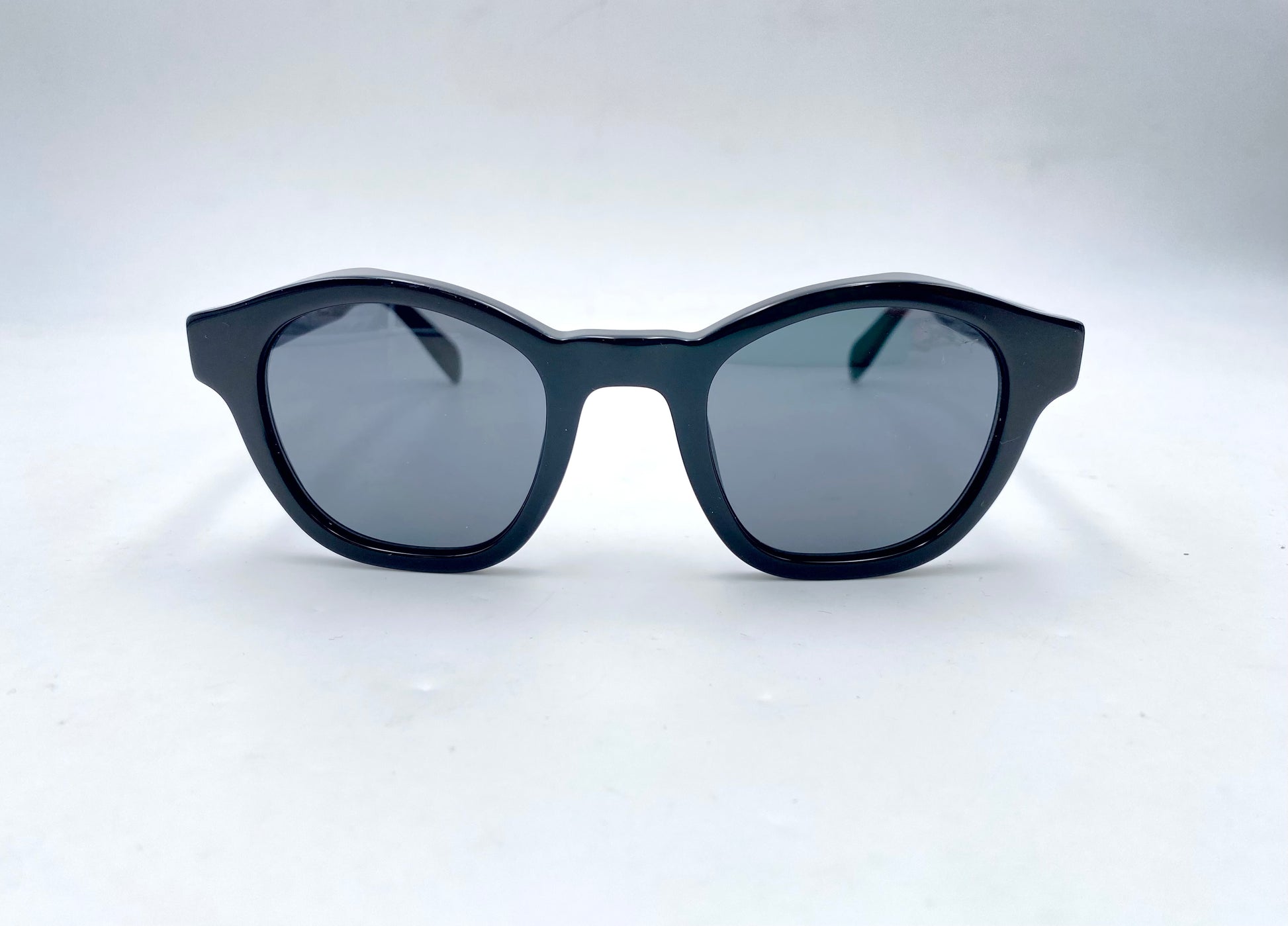 Occhiale da sole Saraghina in acetato nero lucido. Frontale semi-tondo con lenti tinta unita grigio fumo. Asta con logo del brand.