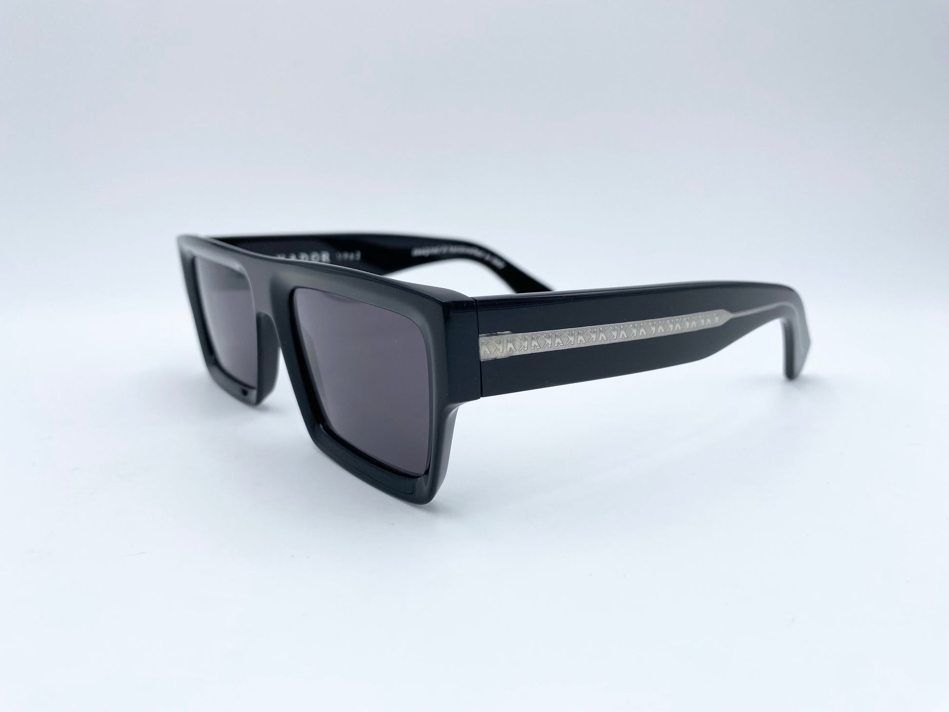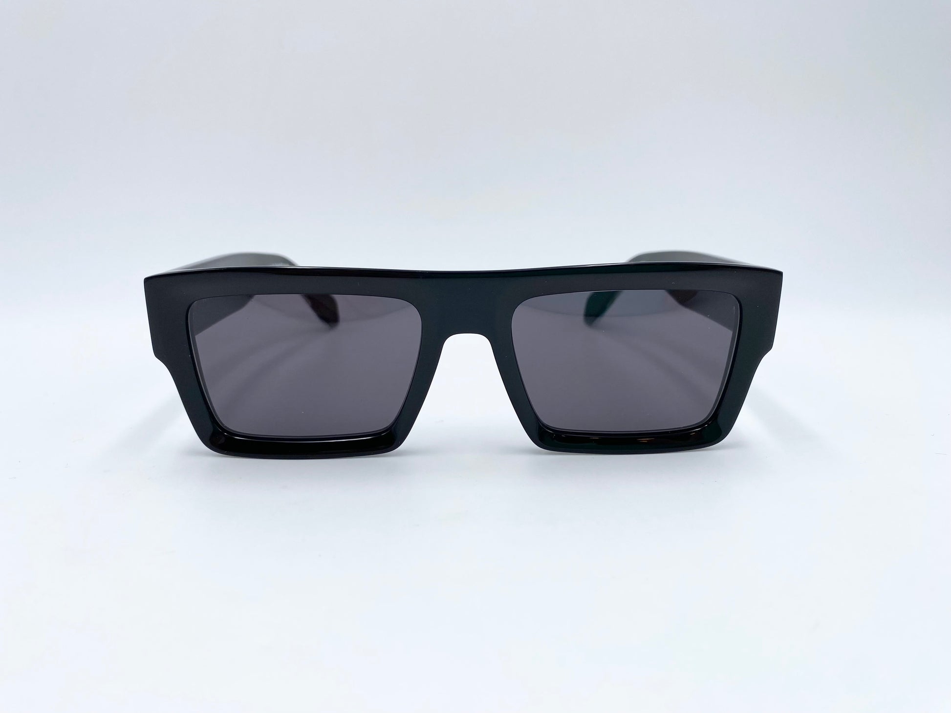 Occhiale da sole in acetato nero con frontale rettangolare e con lenti grigio fumo. Aste spesse e confortevoli con anima in metallo e iniziale del brand. Ponte classico e naselli in acetato.