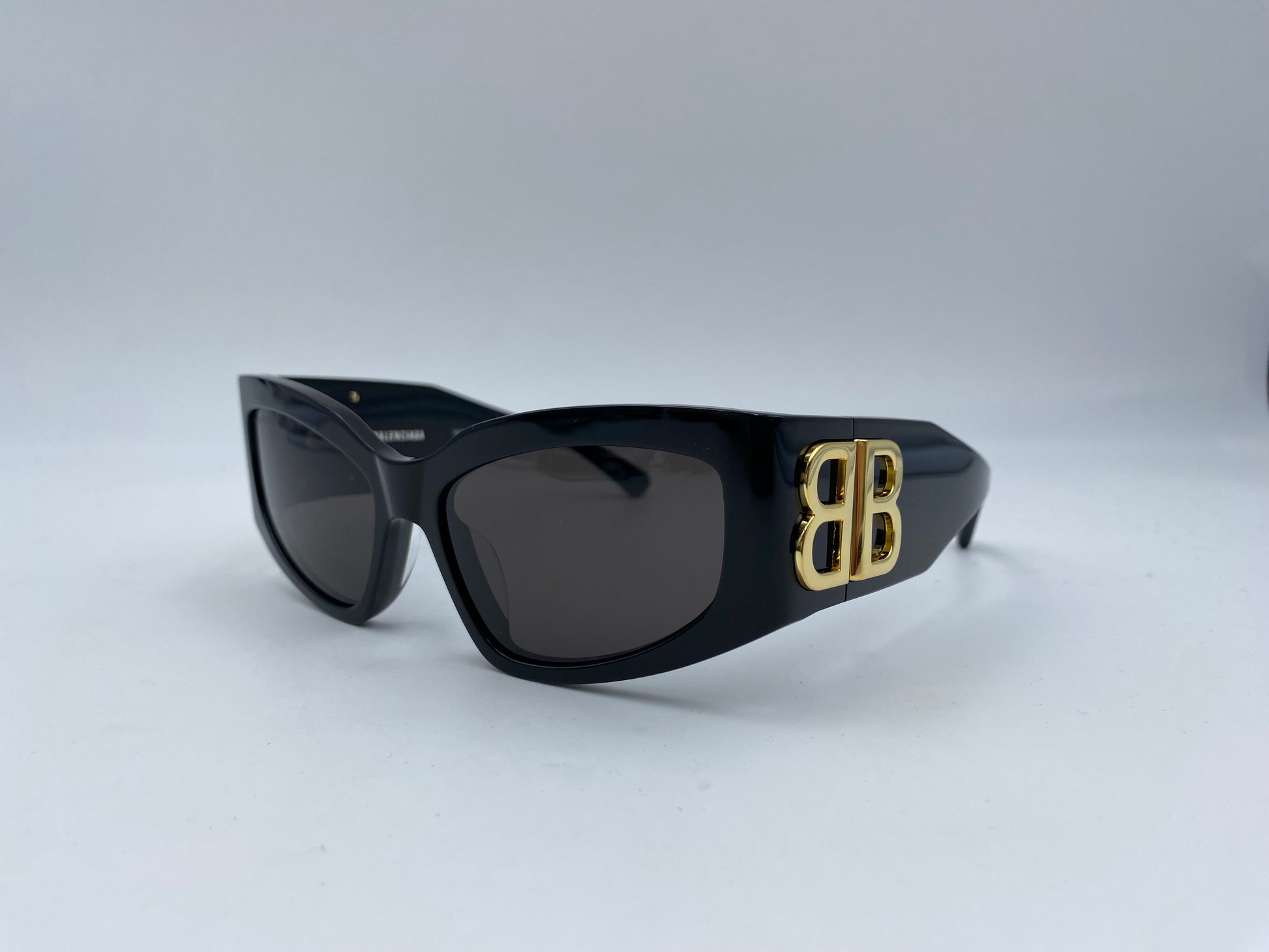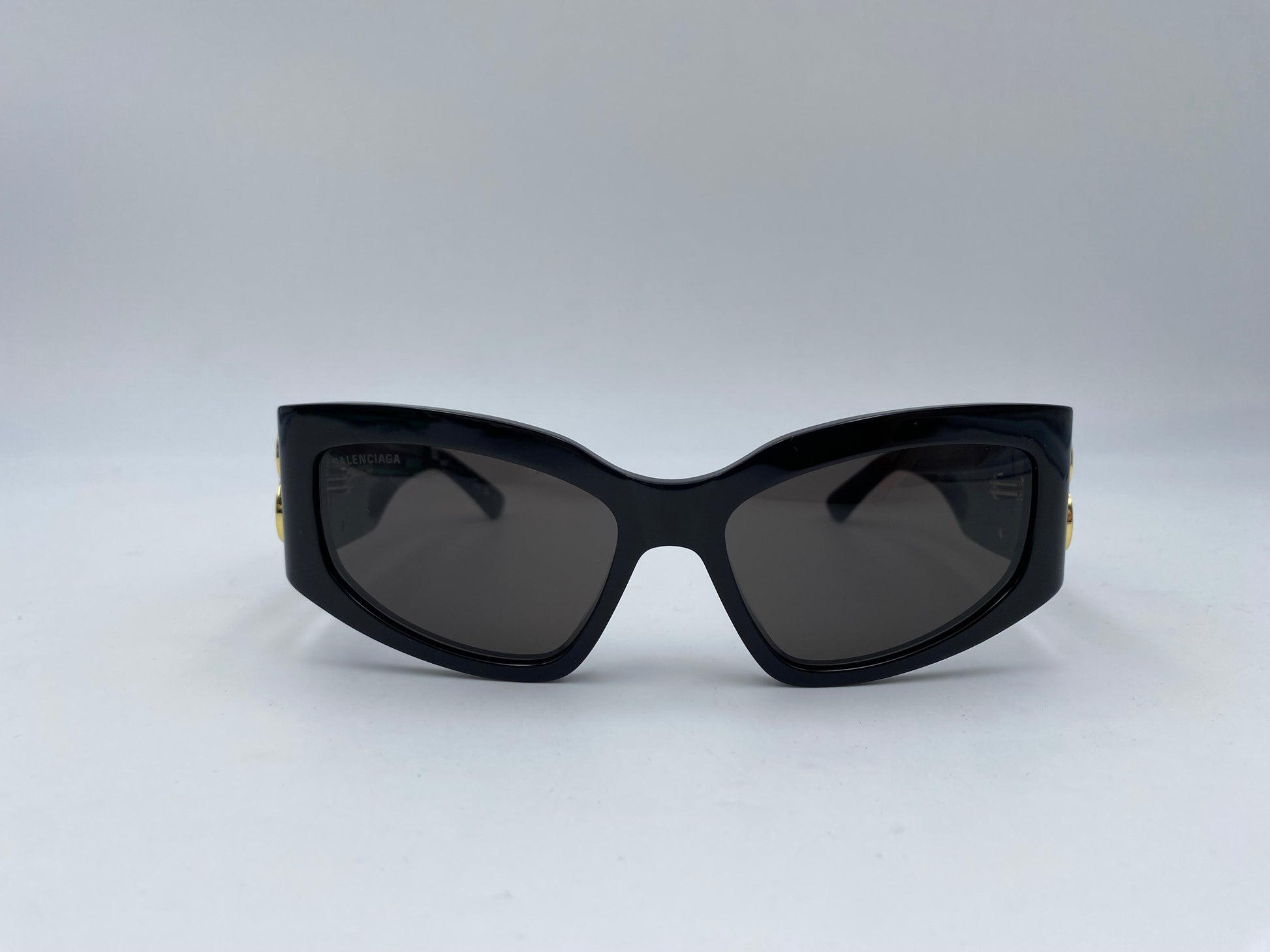 Occhiale da sole in acetato nero lucido. Frontale cat-eye con lenti grigio fumo, aste robuste e confortevoli con iniziali del brand oro. Ponte classico e naselli in acetato.