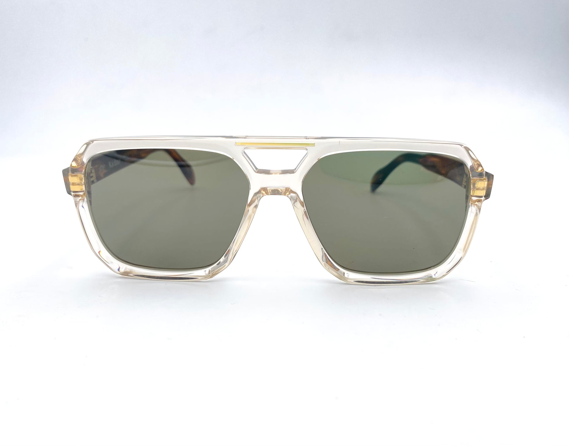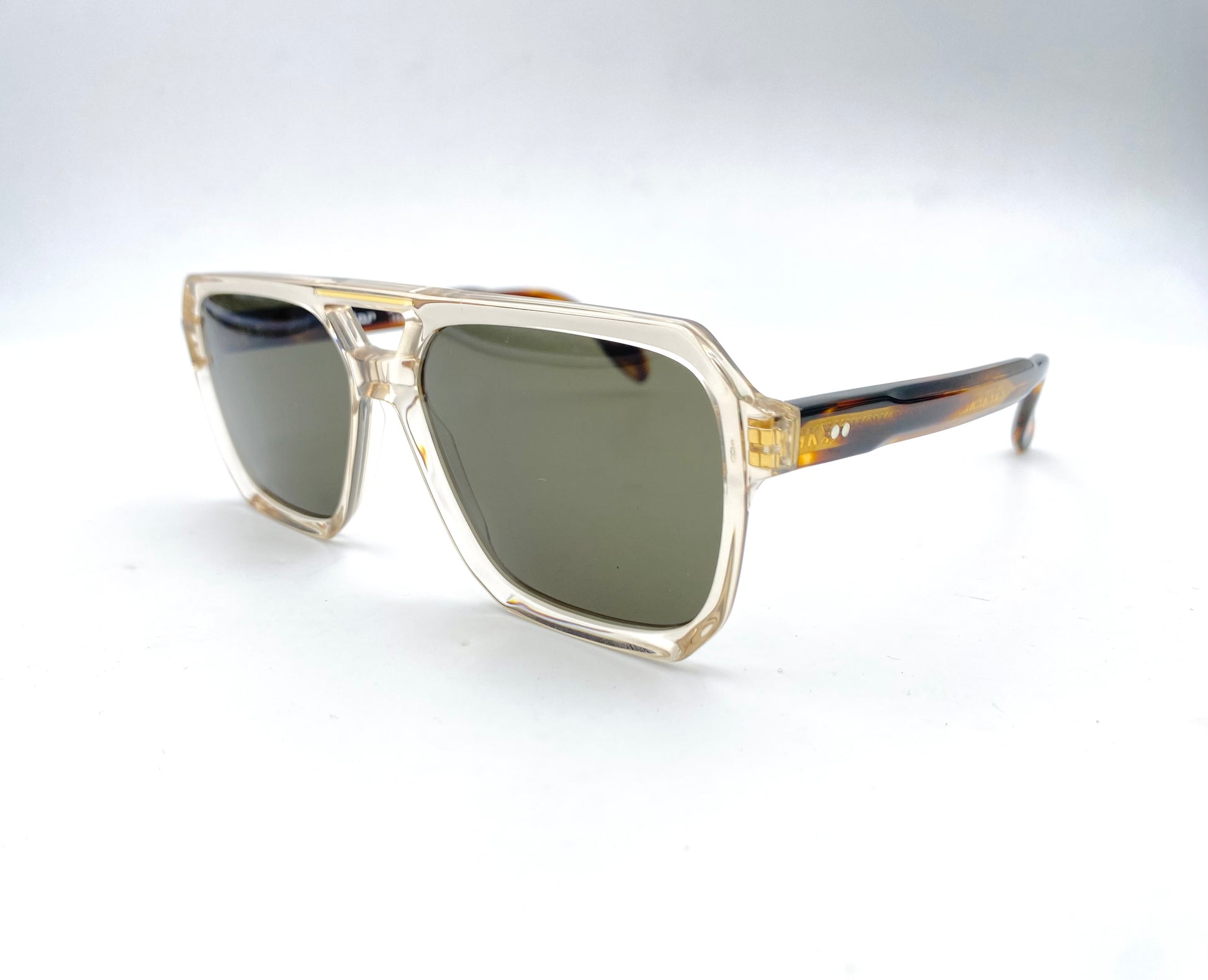 Occhiale da sole firmato Kador. Frontale in acetato lucido colore champagne, stile aviator con doppio ponte e lenti verdi. Aste sottili in acetato tartarugato.
