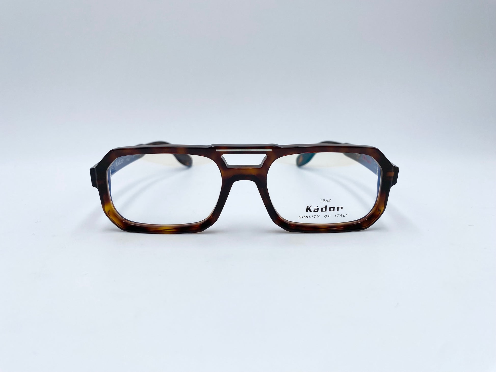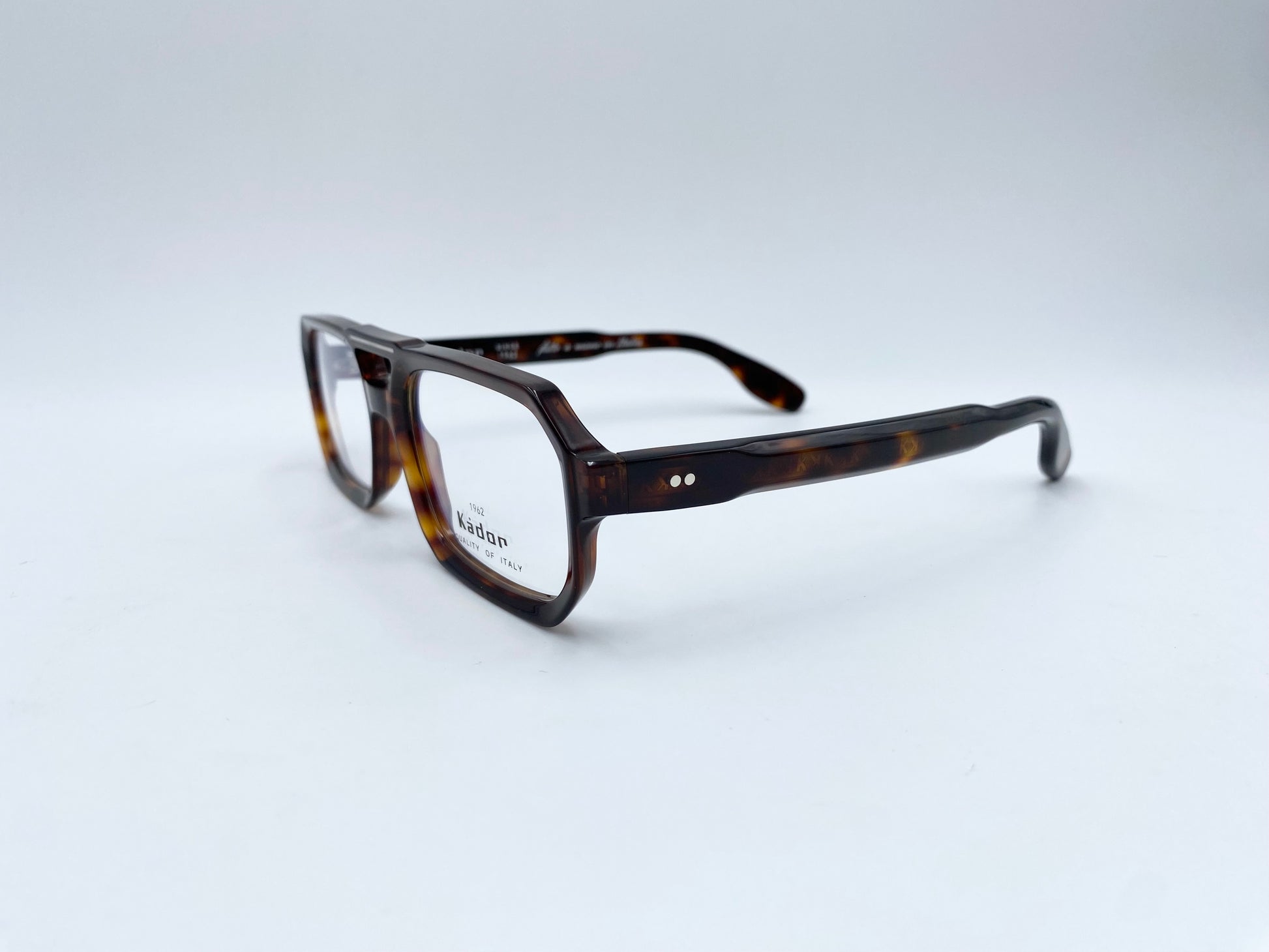 Occhiale da vista in acetato tartarugato dalla forma geometrica stretta. Aste confortevoli con anima in metallo argento e K tipiche del logo. Doppio ponte e naselli in acetato.
