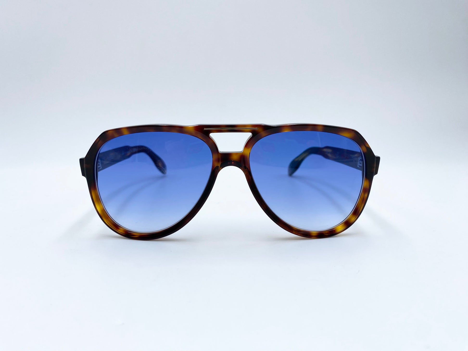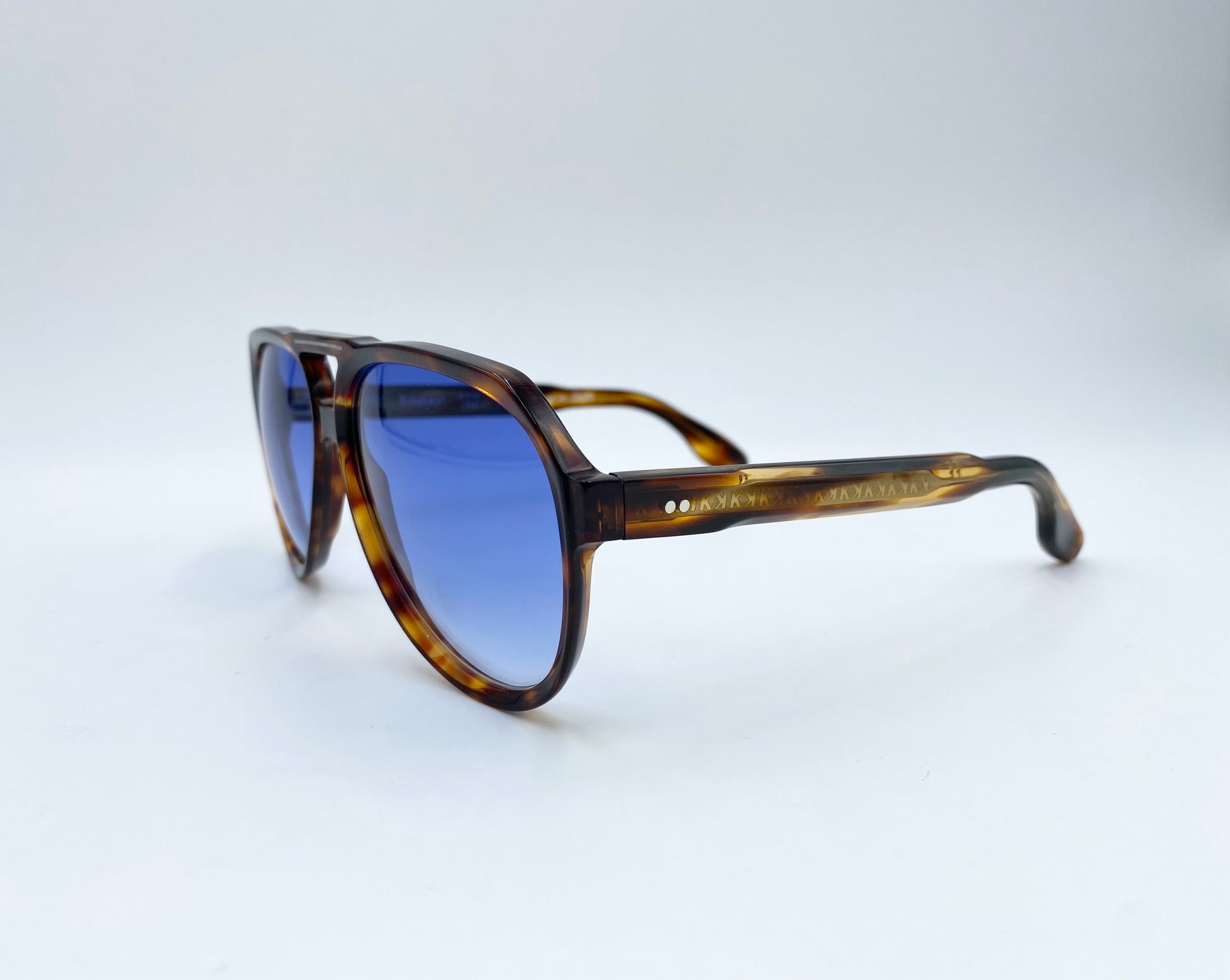 Occhiale da sole firmato Kador in acetato lucido tartarugato. Frontale aviator con doppio ponte e lenti azzurre sfumate. Aste sottili con anima visibile decorata dal tipico logo del brand e classici naselli acetati.