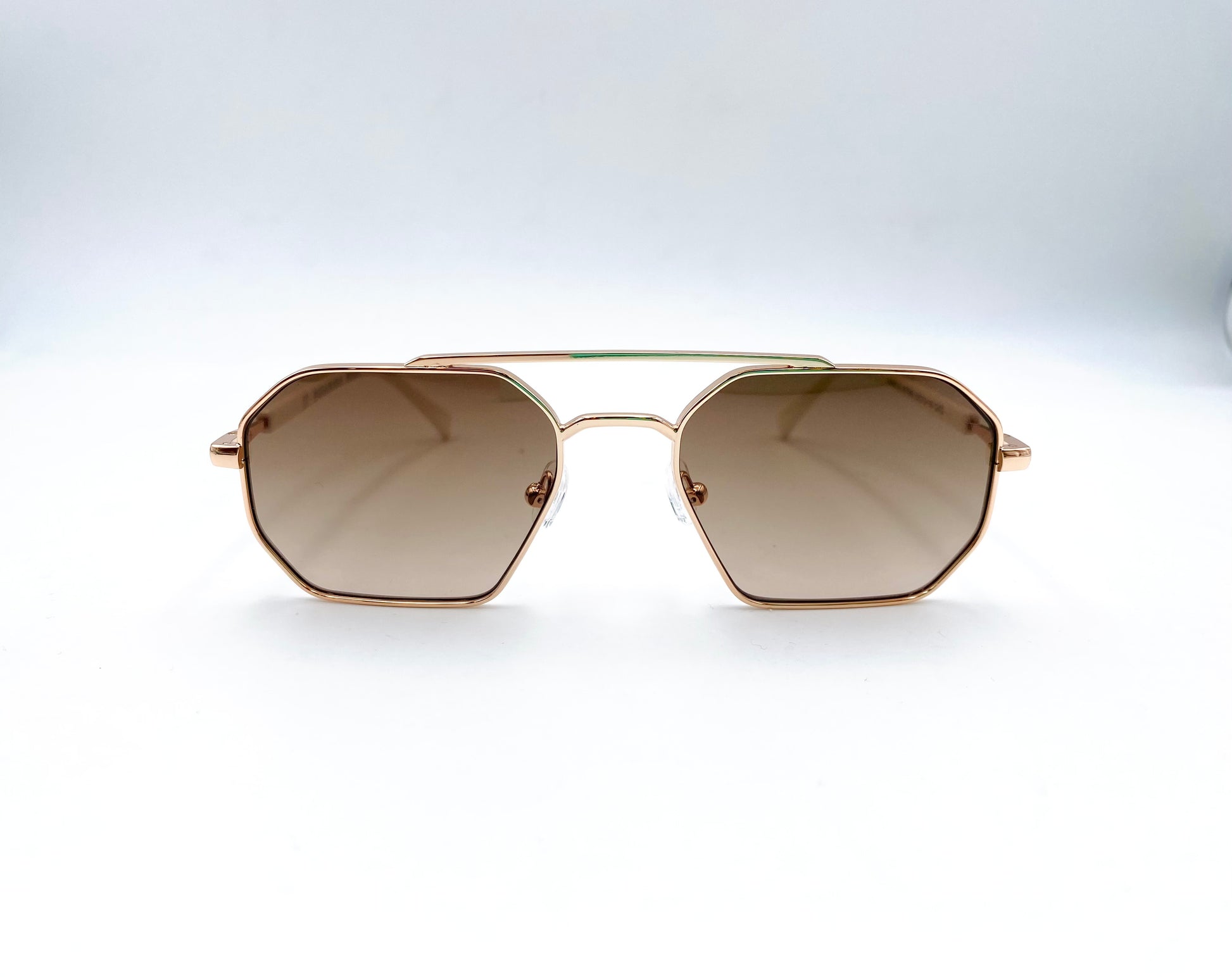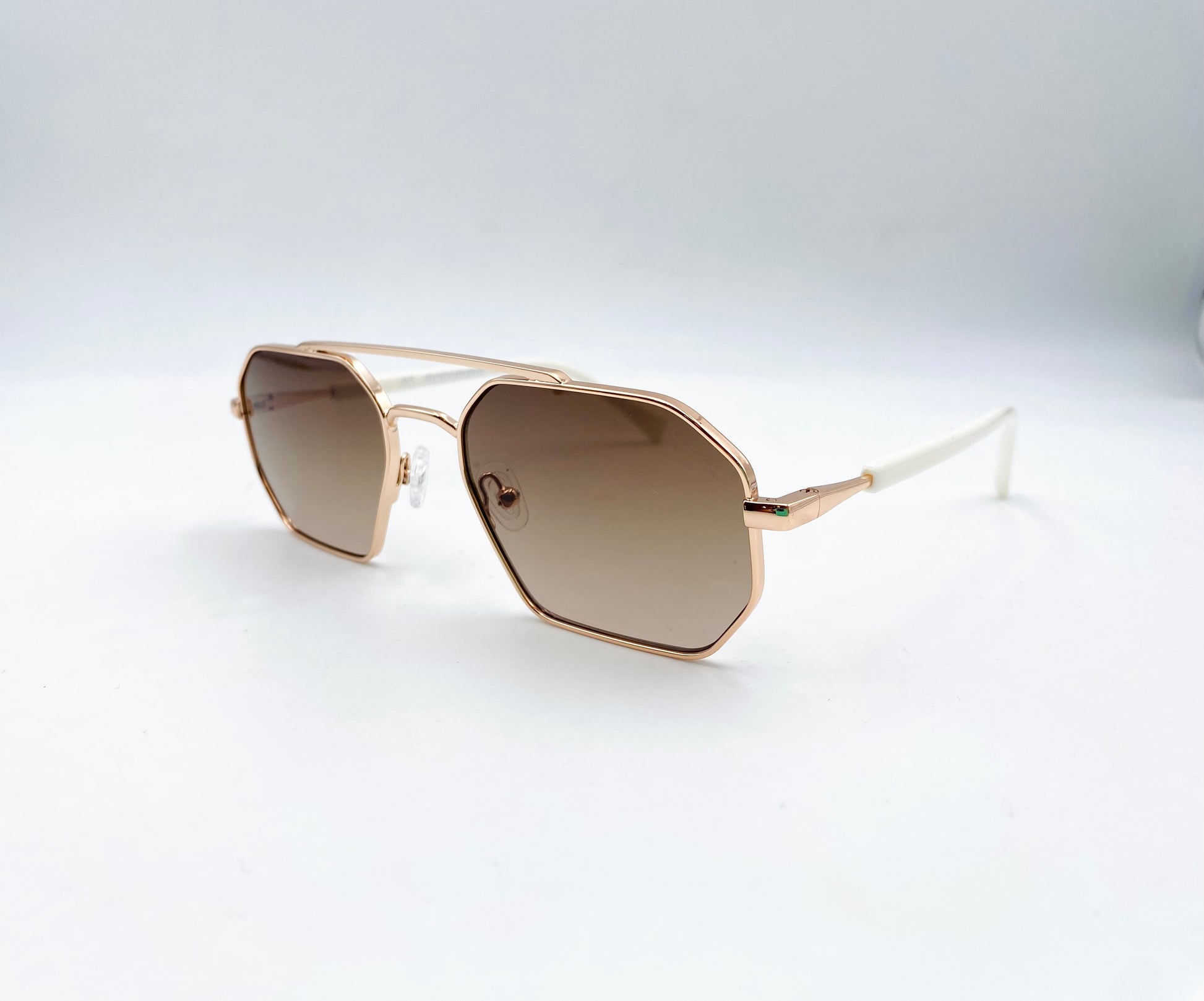 Occhiale da sole in metallo oro. Frontale squadrato stile aviator con doppio ponte. Aste leggere in celluloide colore bianco e lenti marroni. Comodi naselli regolabili.