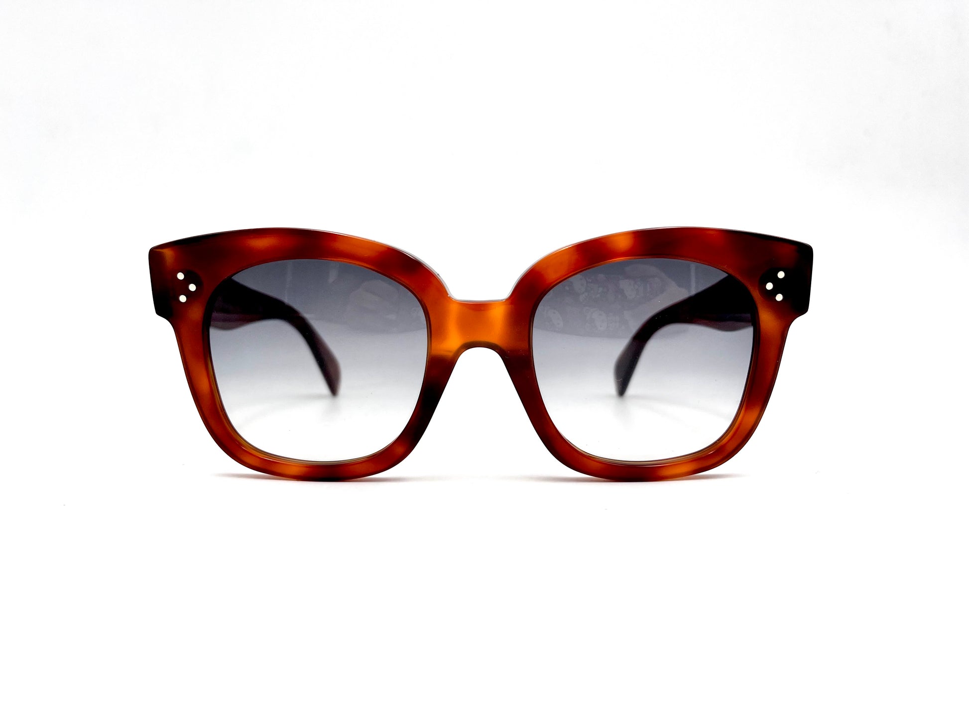Occhiale da sole Celine in acetato tartarugato color miele. Frontale ampio con lenti grigio/azzurre sfumate. Aste con nome del brand oro.