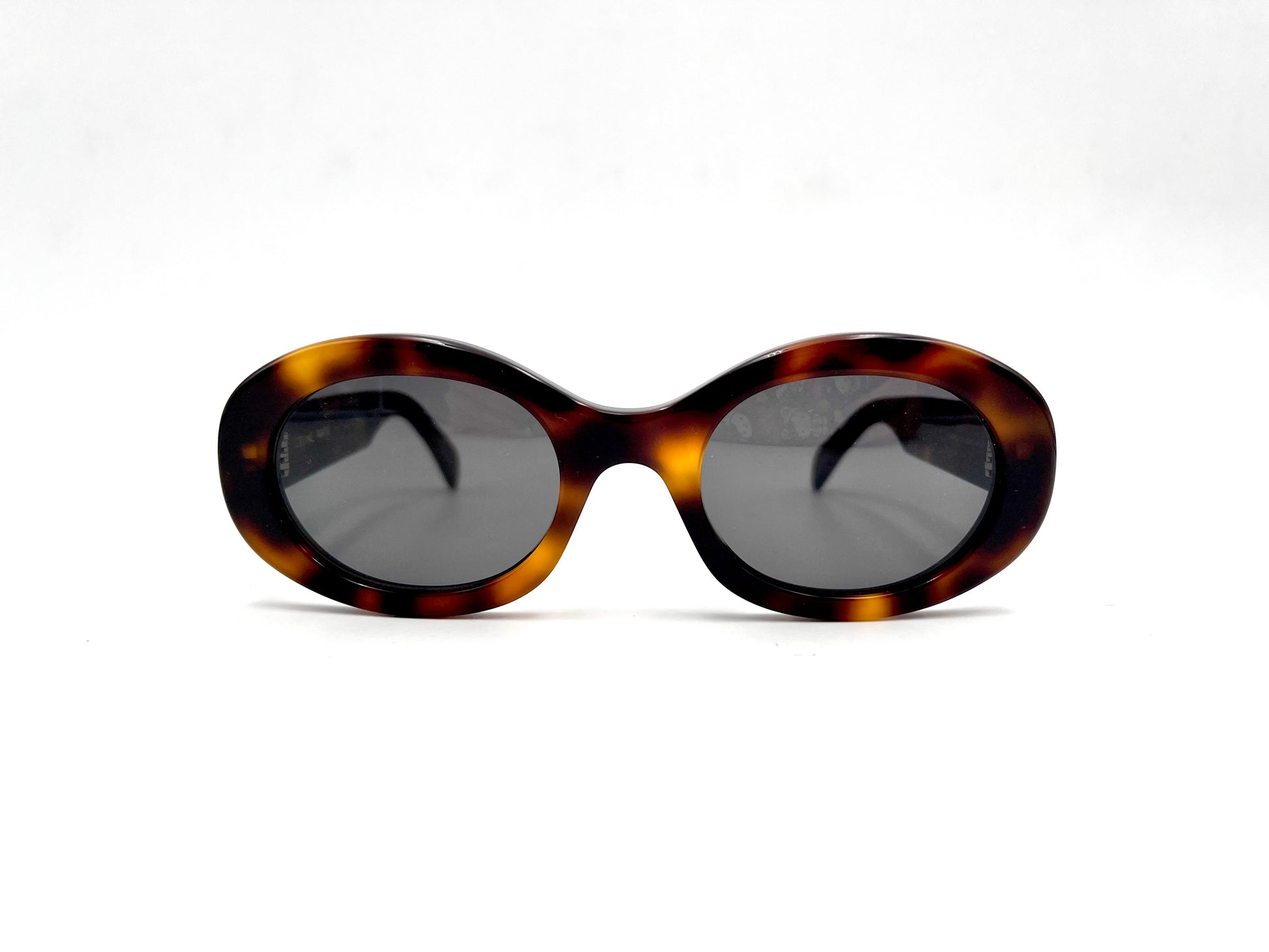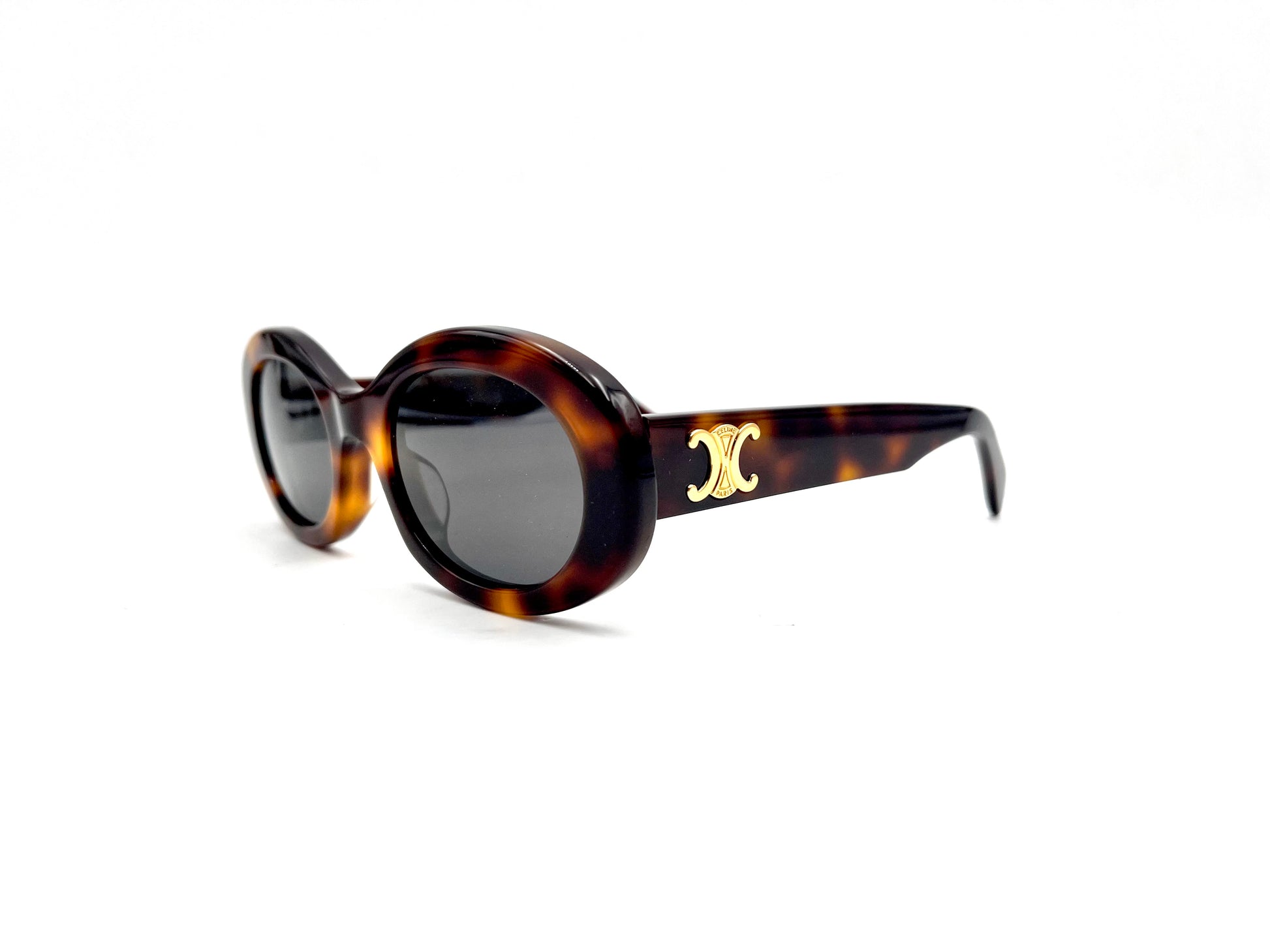 Occhiale da sole Celine in acetato tartarugato lucido. Frontale ovale con lenti grigio fumo. Aste con logo Triomphe oro.