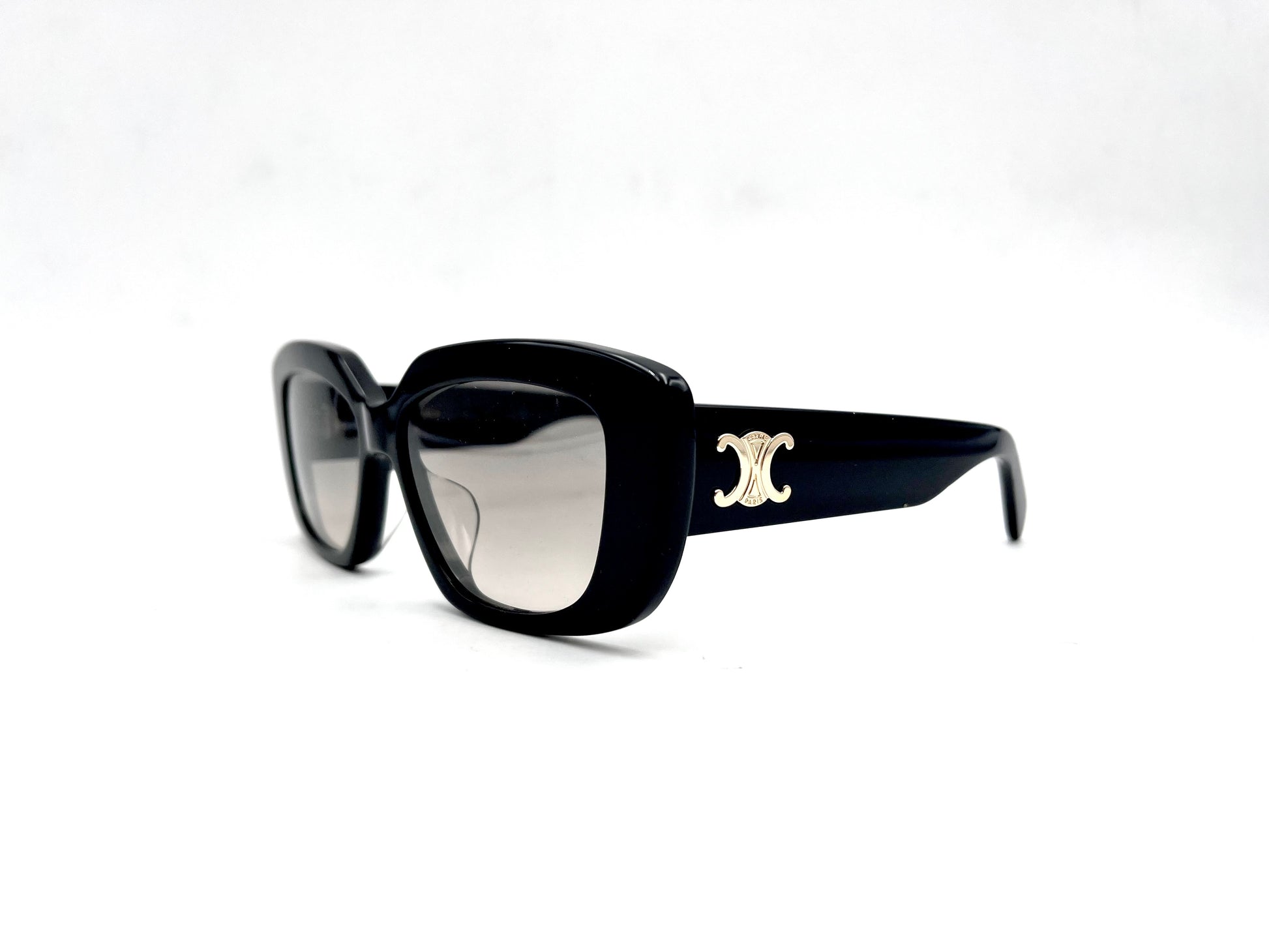 Occhiale da sole Celine in acetato nero lucido. Frontale squadrato con lenti grigio chiaro sfumato. Aste con logo Triomphe.