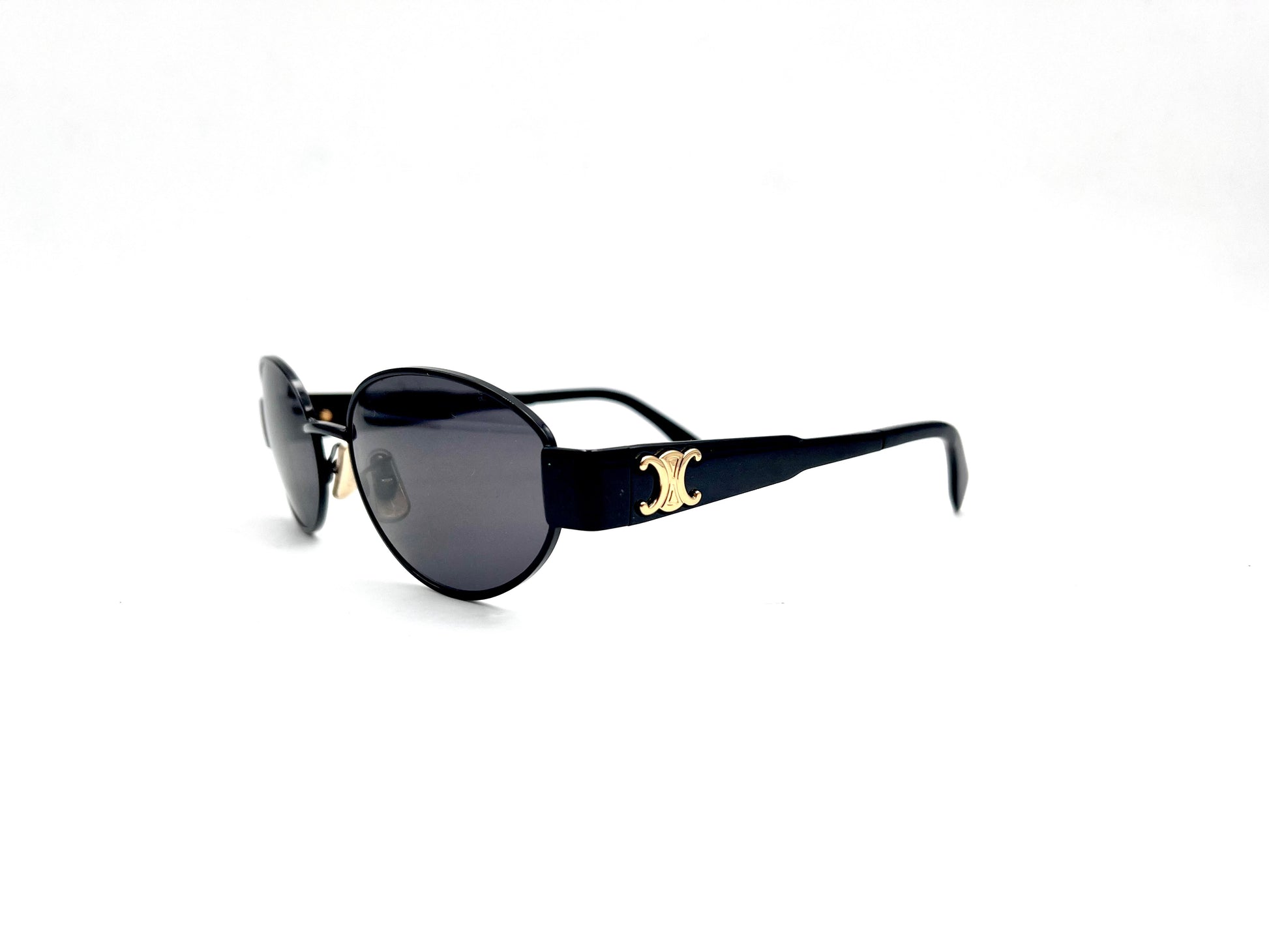 Occhiale da sole Celine in metallo nero. Frontale stretto, ovale con lenti grigio fumo e aste con logo Triomphe oro. Comodi naselli in metallo rivestiti in silicone.