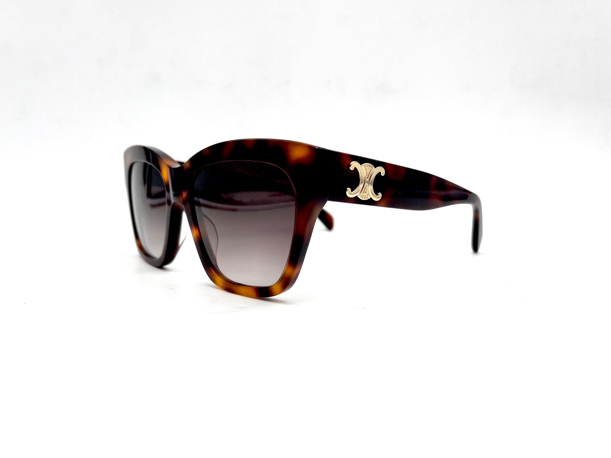 Occhiale da sole Celine in acetato tartarugato lucido. Frontale ampio cat-eye con lenti marroni sfumate. Aste con logo Triomphe oro.