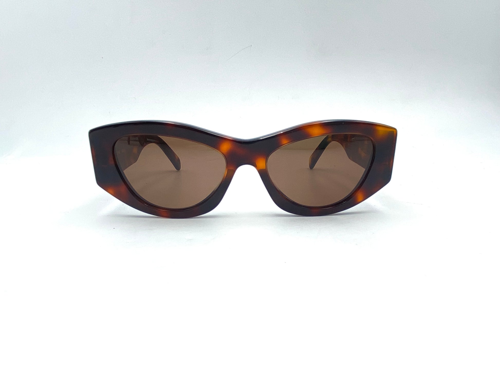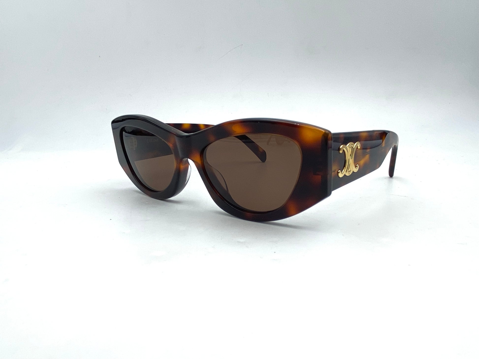 Occhiale da sole Celine in acetato tartarugato lucido. Frontale stretto e allungato, lenti marroni e aste spesse con logo Triomphe oro.