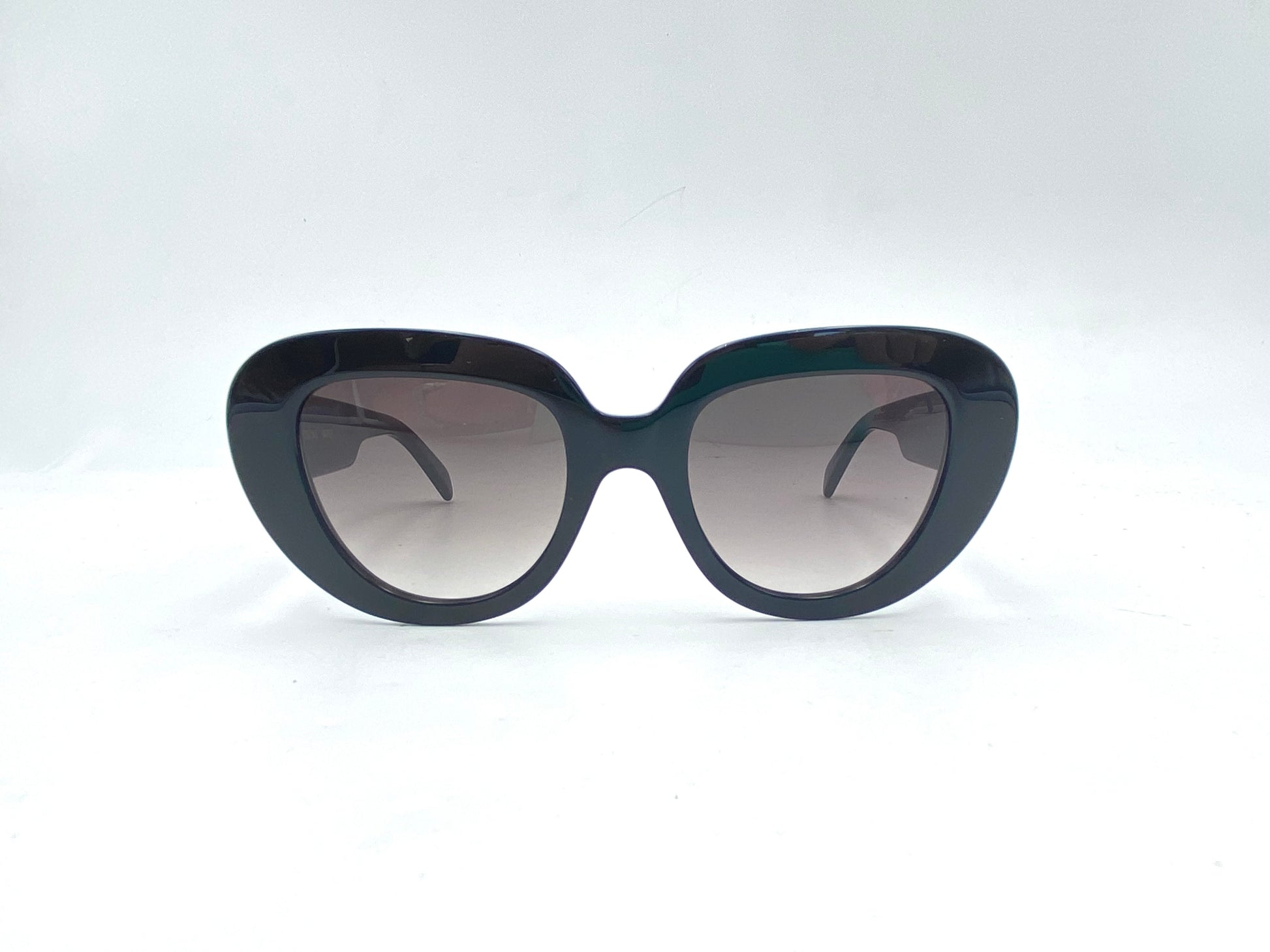 Occhiale da sole Celine in acetato nero lucido. Frontale cat-eye dalle forme morbide. Montatura spessa e lenti grigio sfumato. Aste con nome del brand oro.
