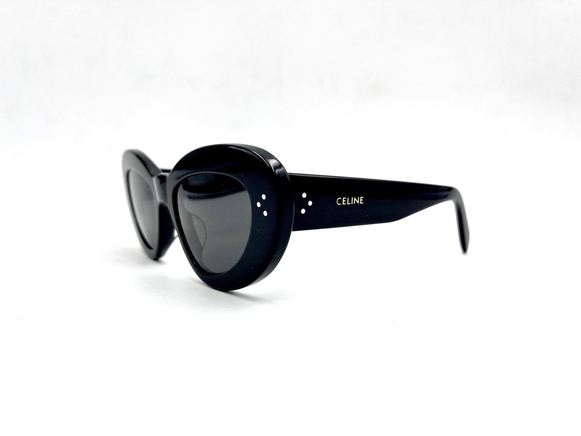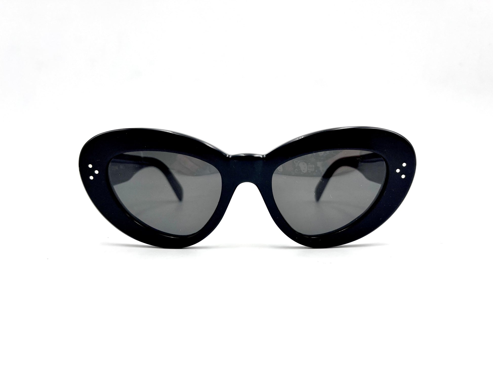 Occhiale da sole Celine in acetato nero lucido. Frontale cat-eye, montatura spessa e aste con nome del brand oro.