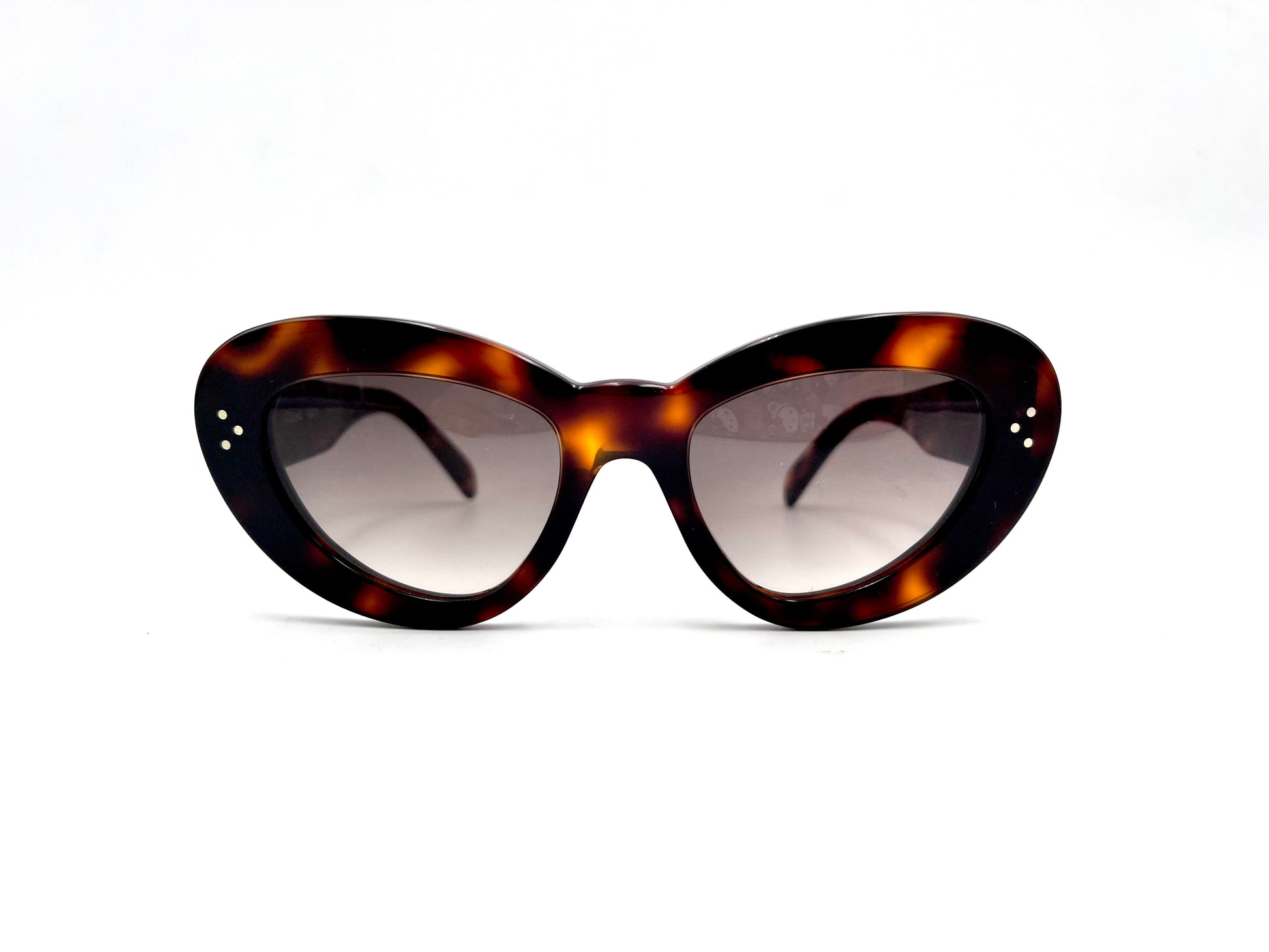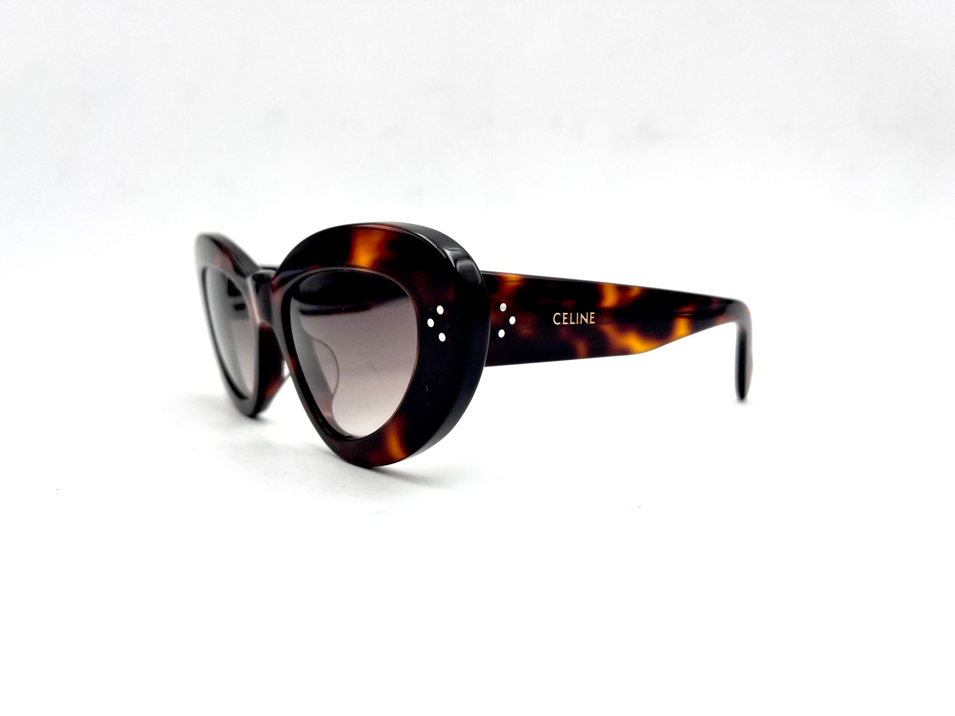 Occhiale da sole Celine in acetato tartarugato lucido. Frontale cat-eye dalla montatura spessa e lenti marroni sfumate. Aste con nome del brand oro.