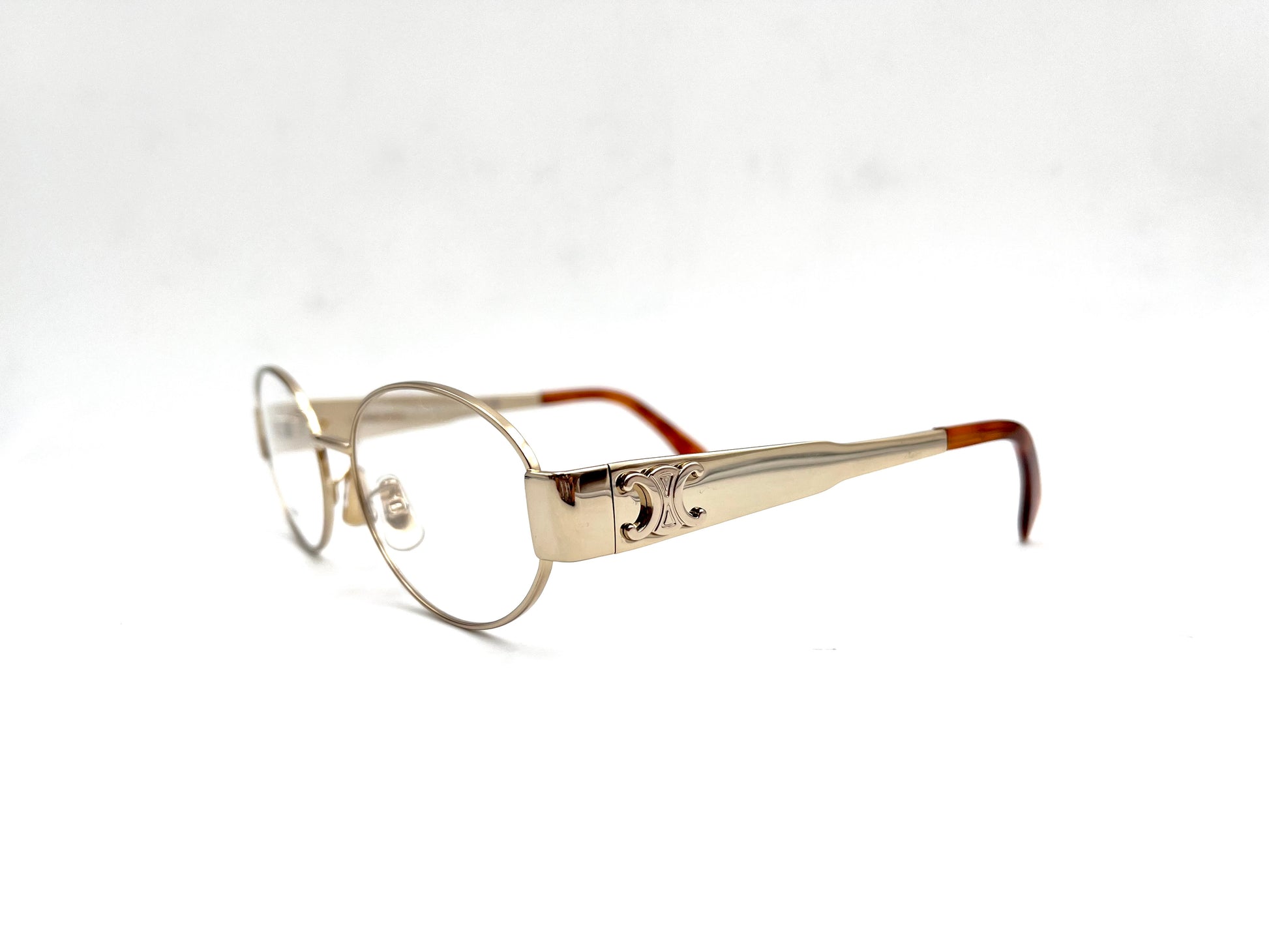Montatura da vista Celine in metallo oro. Frontale stretto ovale e aste con logo Triomphe con terminali in acetato color miele.