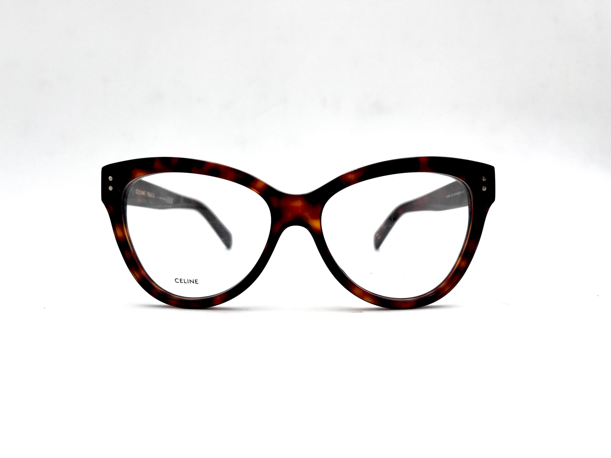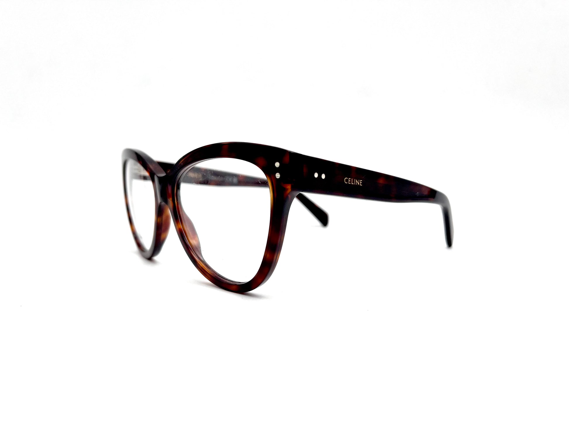 Montatura da vista Celine in acetato tartarugato lucido. Frontale ampio cat-eye e aste comode e leggere con nome del brand oro.