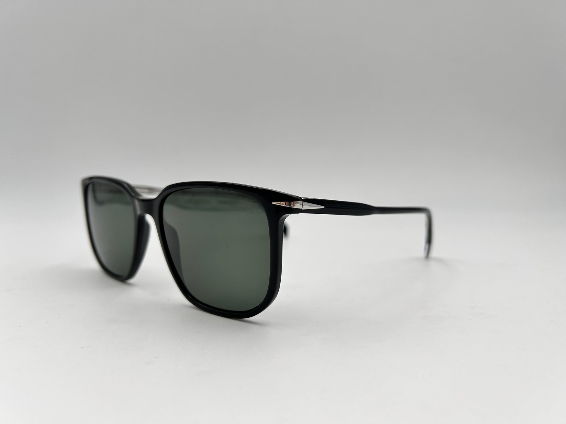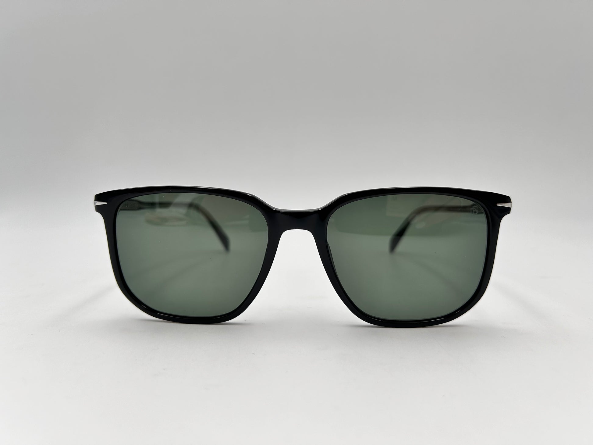 Occhiale da sole firmato David Beckham. Montatura in acetato color nero, frontale di forma rettangolare con lenti verde scuro tinta unita e punti luce in argento che si collegano alle astine leggerissime. Comodi naselli in acetato