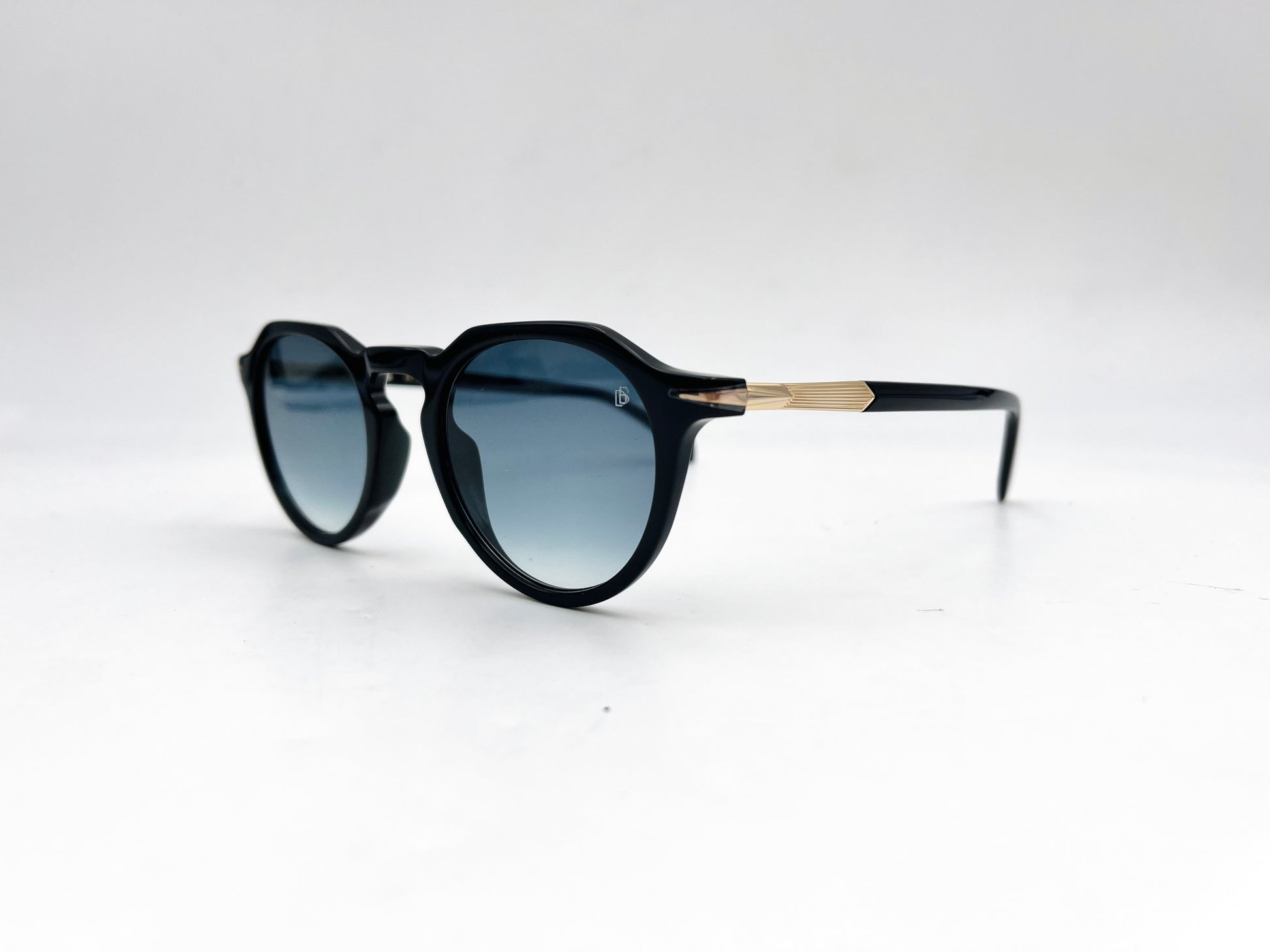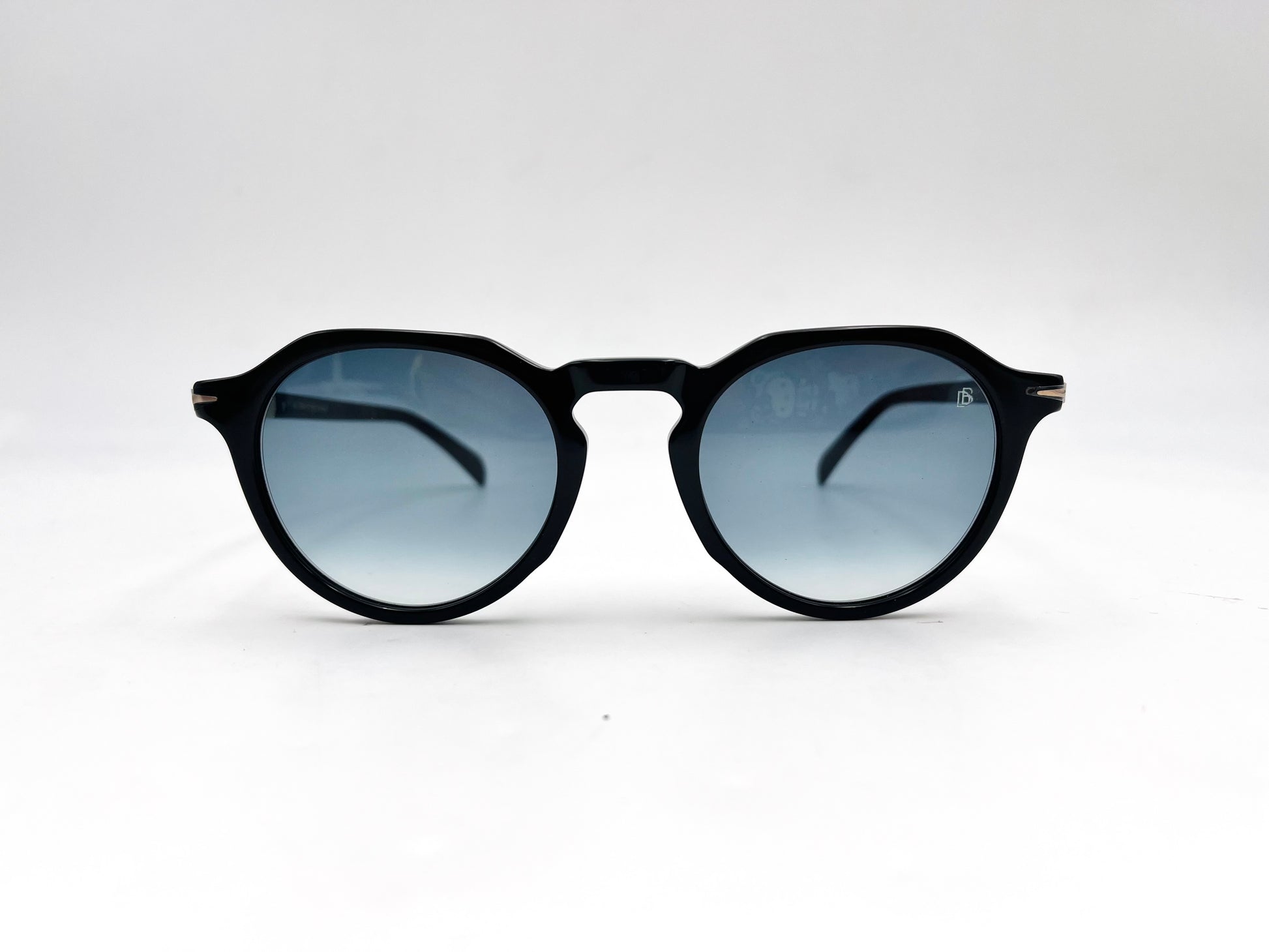 Occhiale da sole David Beckham in acetato nero lucido. Frontale phantos con lenti blu sfumate. Aste leggere in metallo e celluloide.