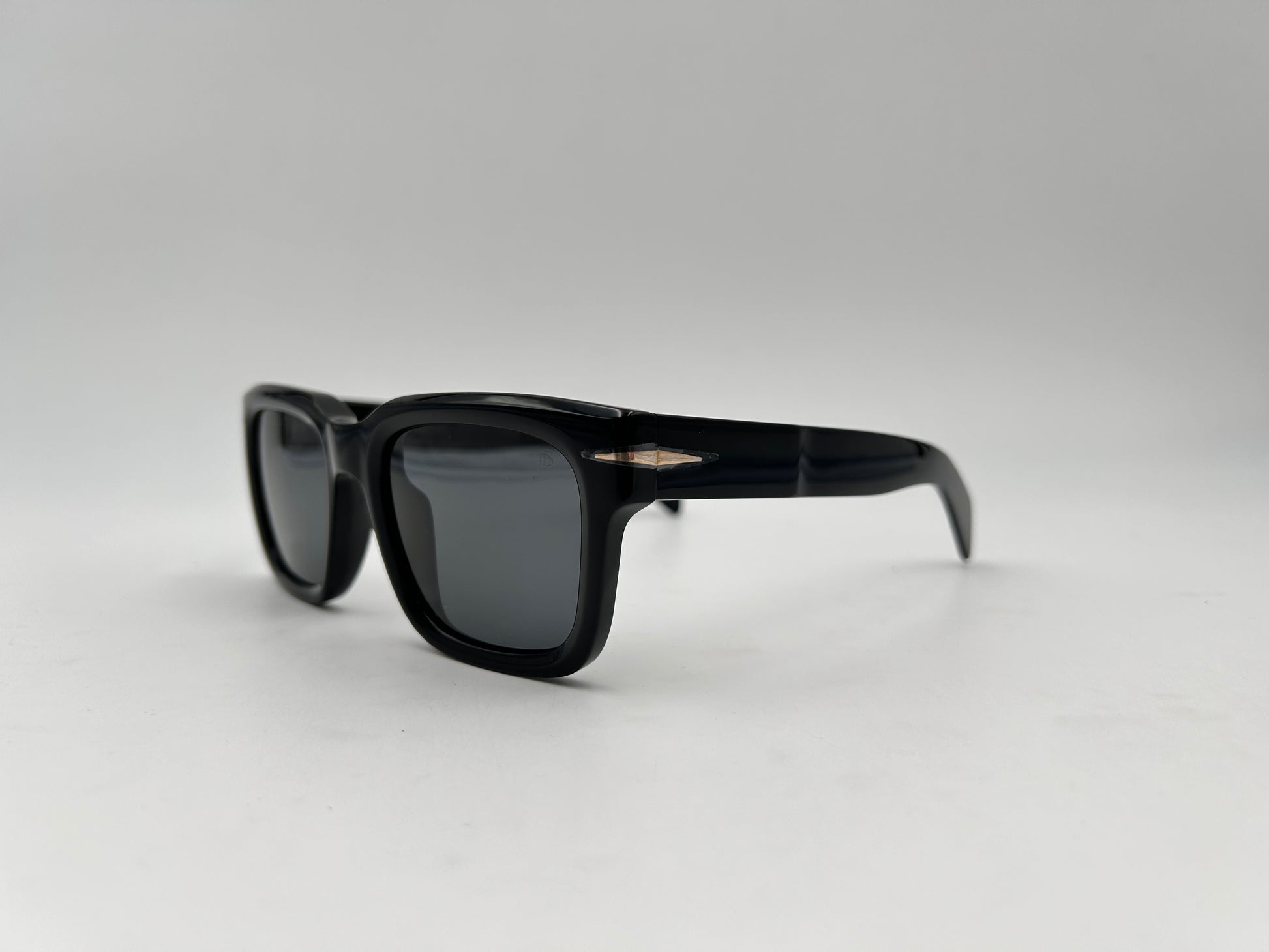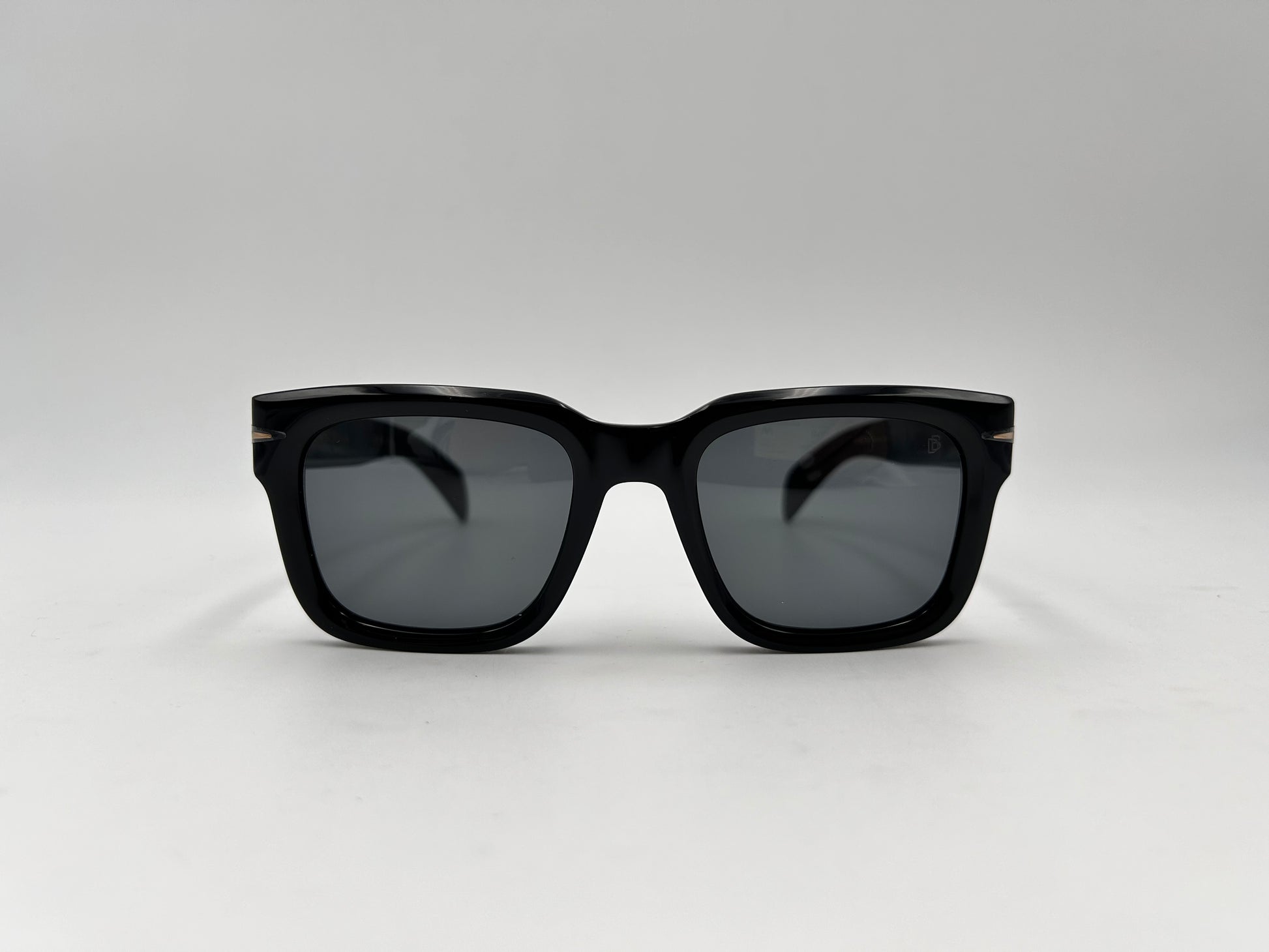 Occhiale da sole firmato David Beckham. Montatura in acetato color nero lucido, frontale squadrato con lenti grigie tinta unita e punti luce oro che si collegano alle astine leggerissime. Comodi naselli acetati.