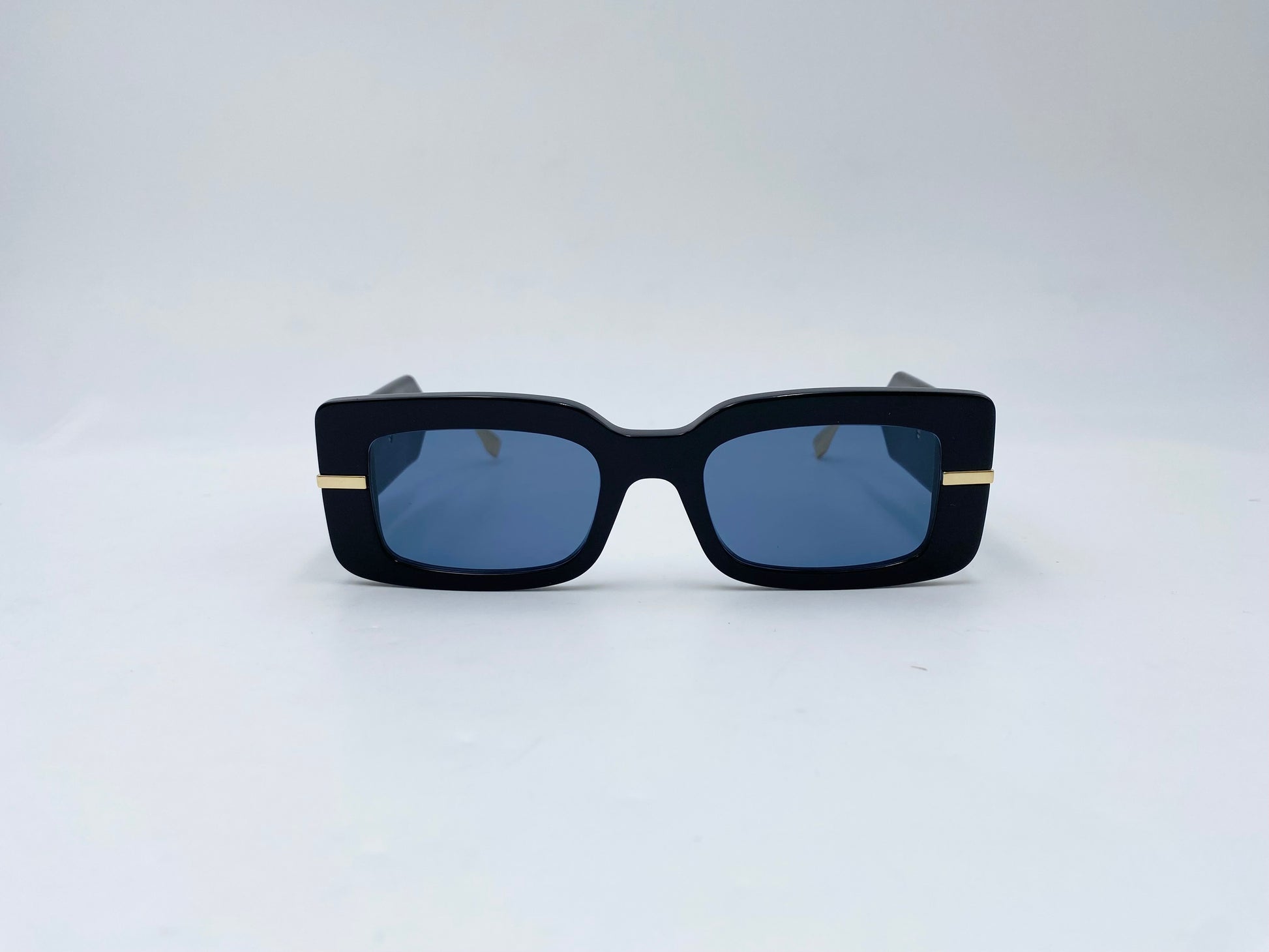Occhiale da sole Fendi in acetato nero lucido. Frontale stretto rettangolare e lenti grigio fumo. Aste particolari spesse con nome del brand in rilievo e banda in metallo oro .