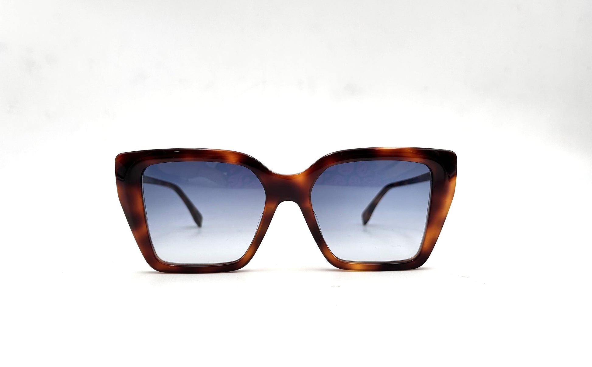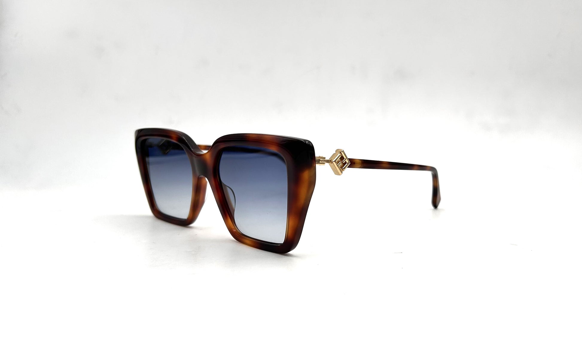 Occhiale da sole Fendi in acetato tartarugato chiaro lucido. Frontale cat-eye con lenti blu sfumate e aste ultra sottili con logo a rombo in metallo oro.