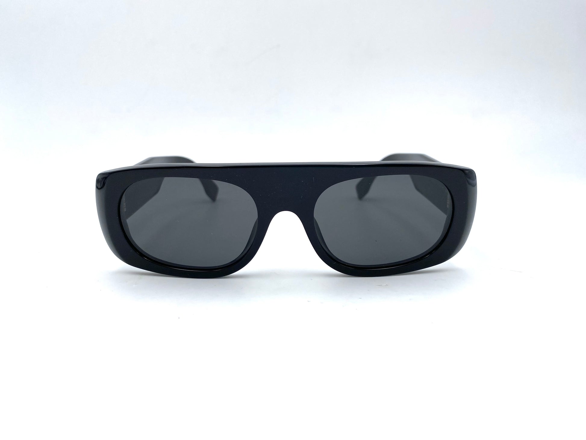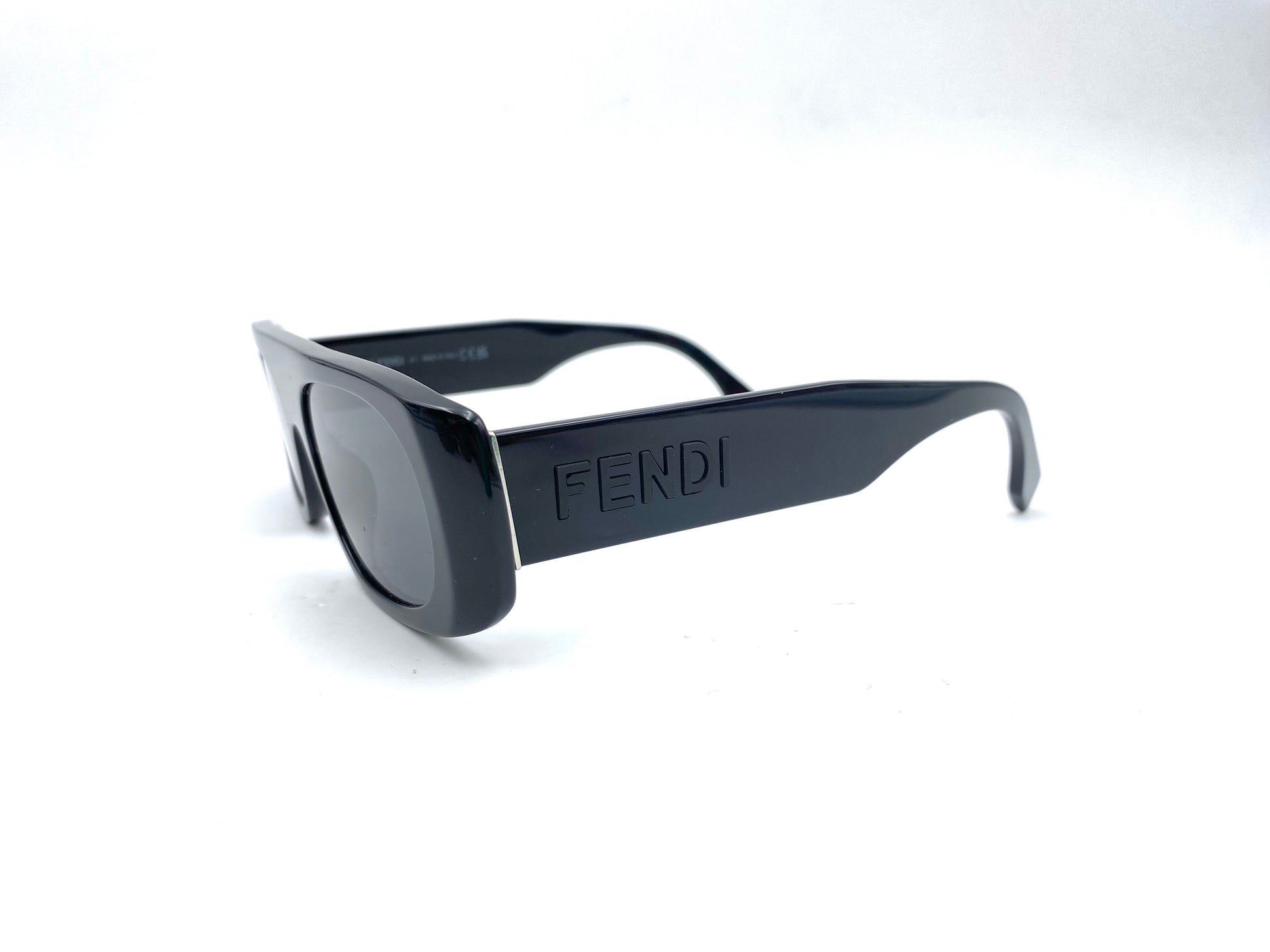 Occhiali da sole Fendi in acetato nero lucido. Frontale dritto e stretto con lenti ovali. Lenti grigio fumo e aste spesse con nome del brand.