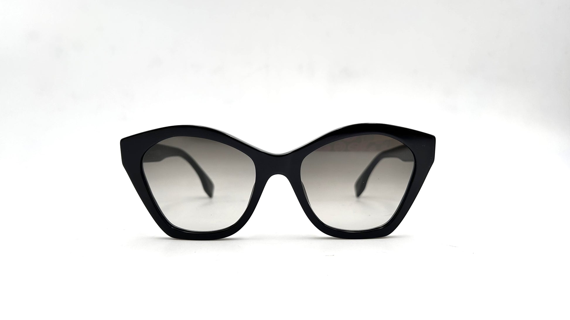 Occhiale da sole Fendi in acetato nero lucido. Frontale cat-eye e lenti grigio sfumato. Aste con nome del brand oro.