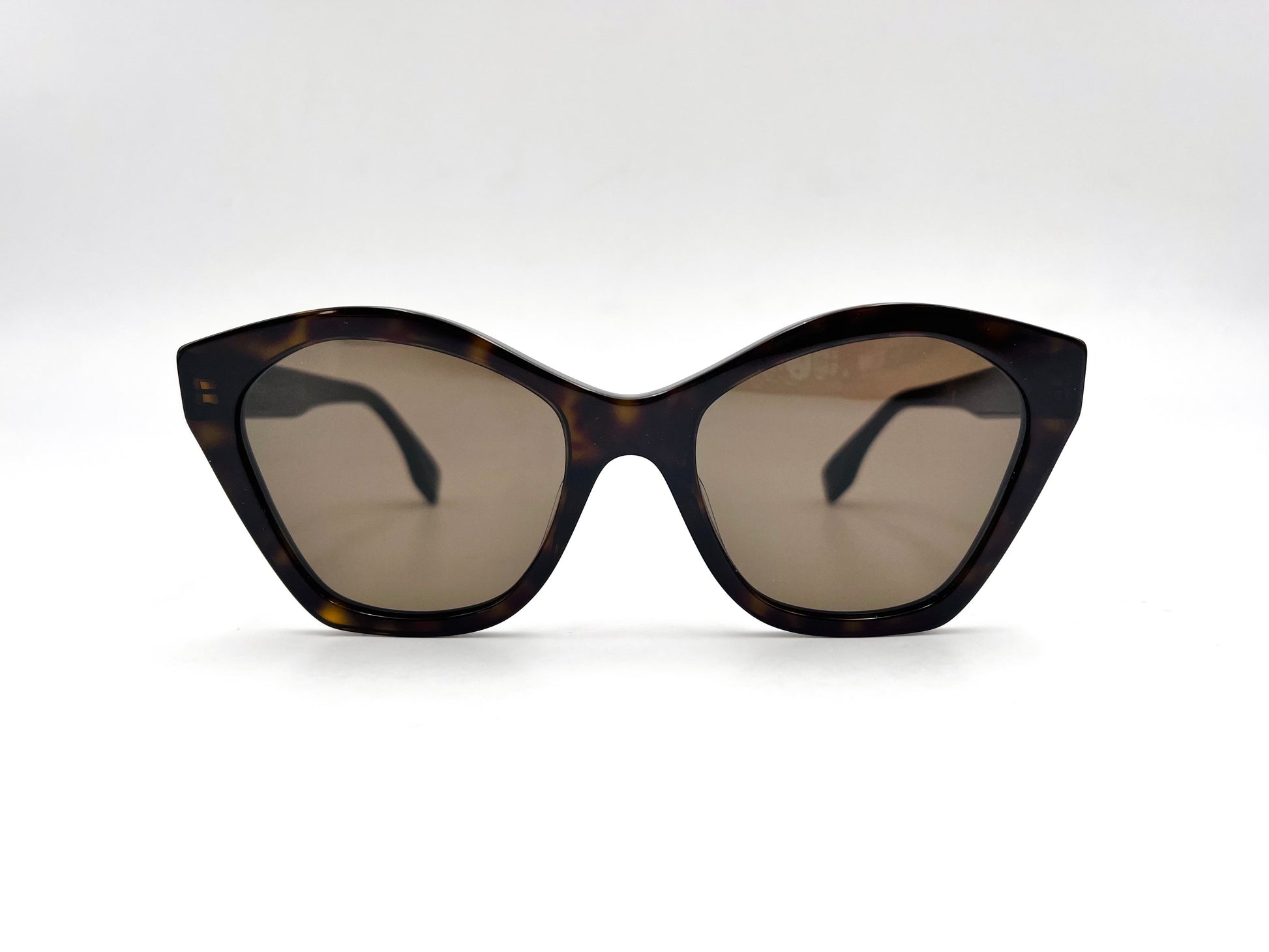Occhiale da sole Fendi in acetato lucido tartarugato. Frontale cat-eye e lenti marroni tinta unita. Comode aste con nome del brand oro.