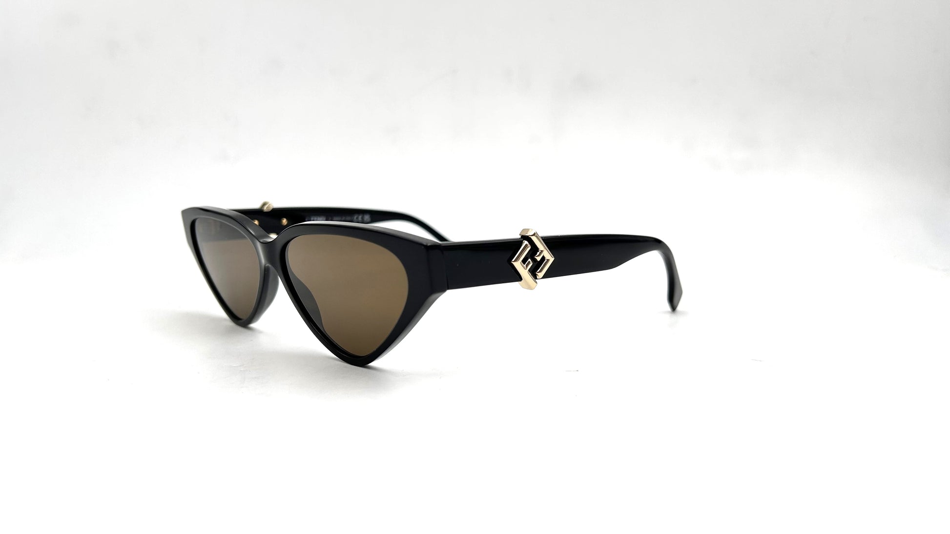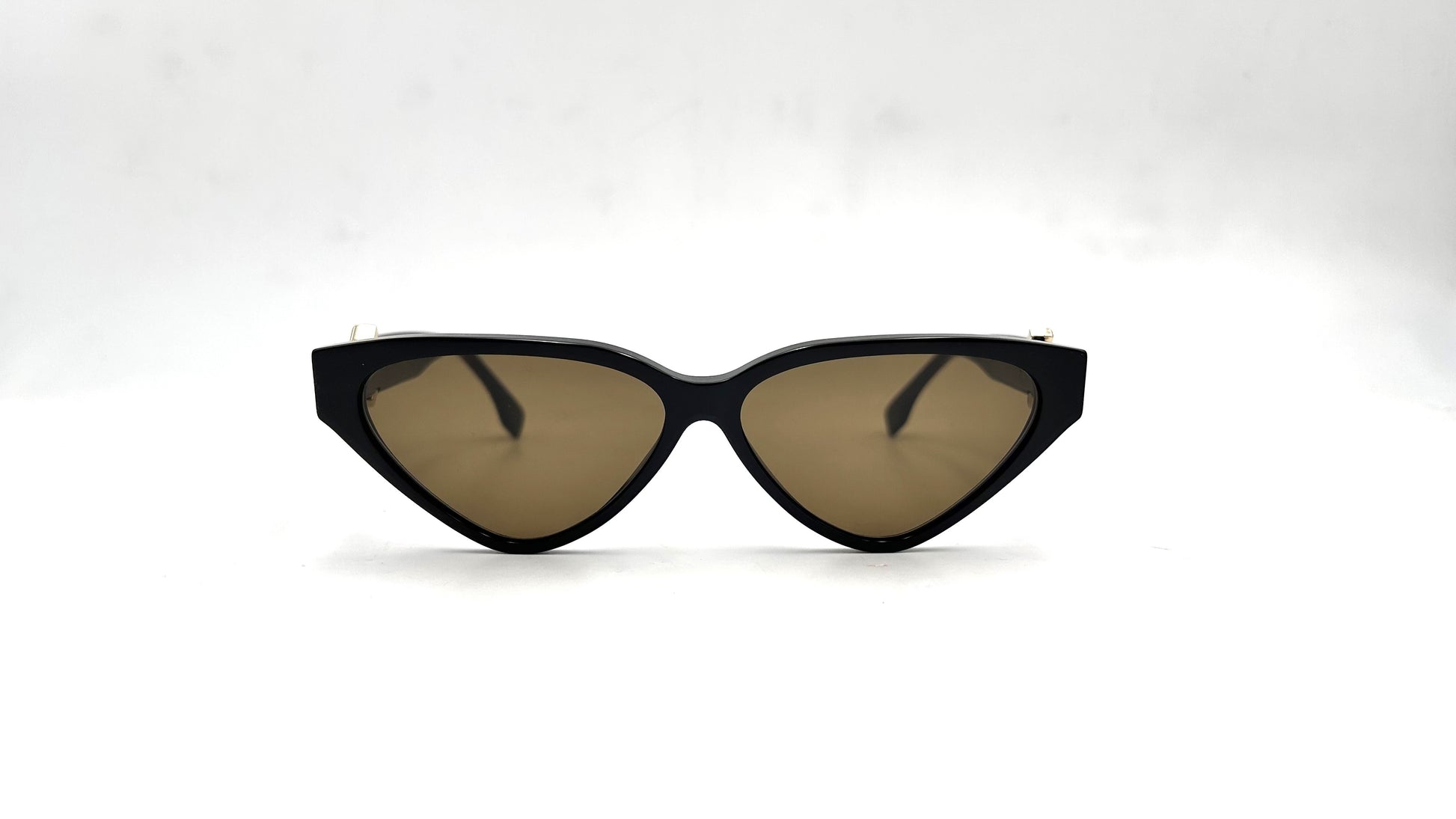 Occhiale da sole Fendi in acetato tartarugato. Frontale stretto cat-eye con lenti marroni. Aste con logo del brand a rombo in metallo oro.