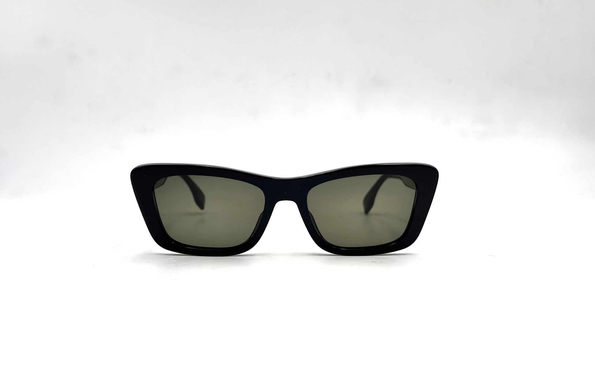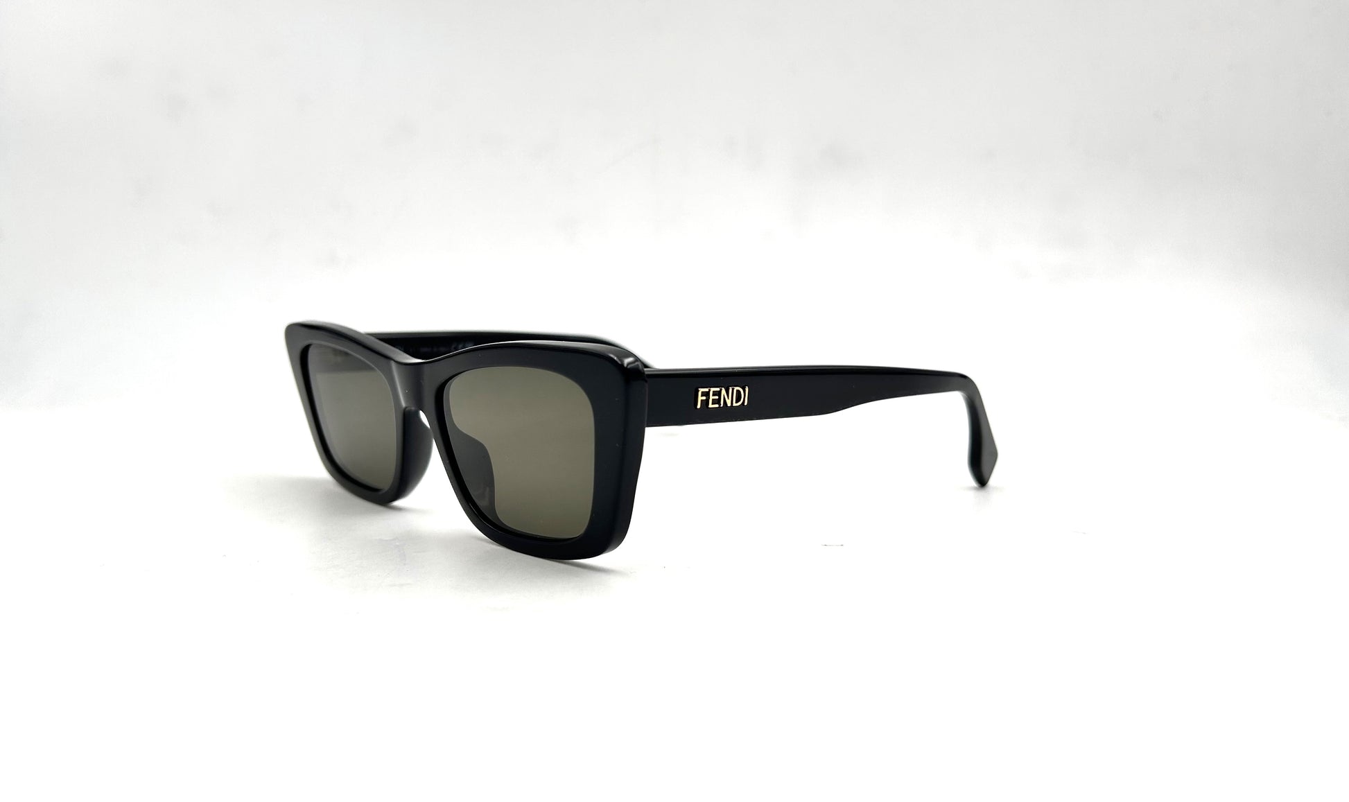 Occhiale da sole Fendi in acetato nero lucido. Frontale stretto e lenti grigio/verdi. Aste con nome del brand oro.
