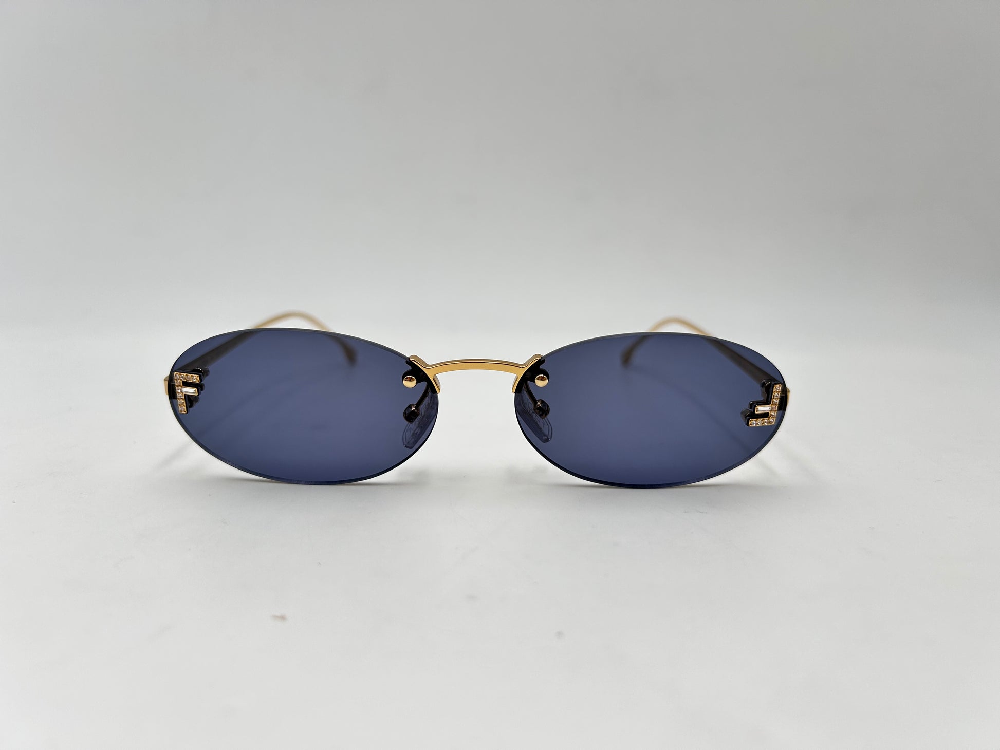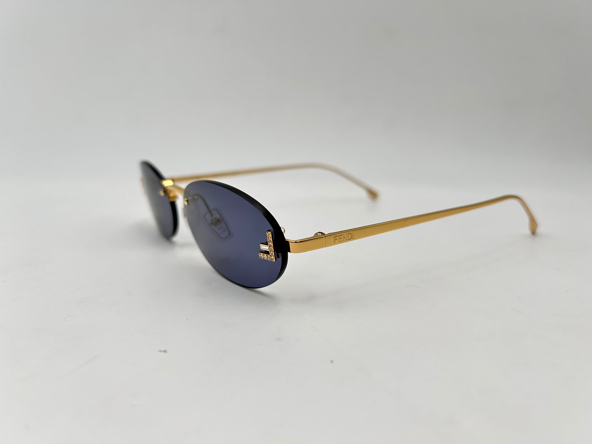 Occhiale da sole firmato Fendi in glasant. Frontale con lenti blu e dettaglio del logo con strass. Aste leggere in metallo oro e comodi naselli regolabili.