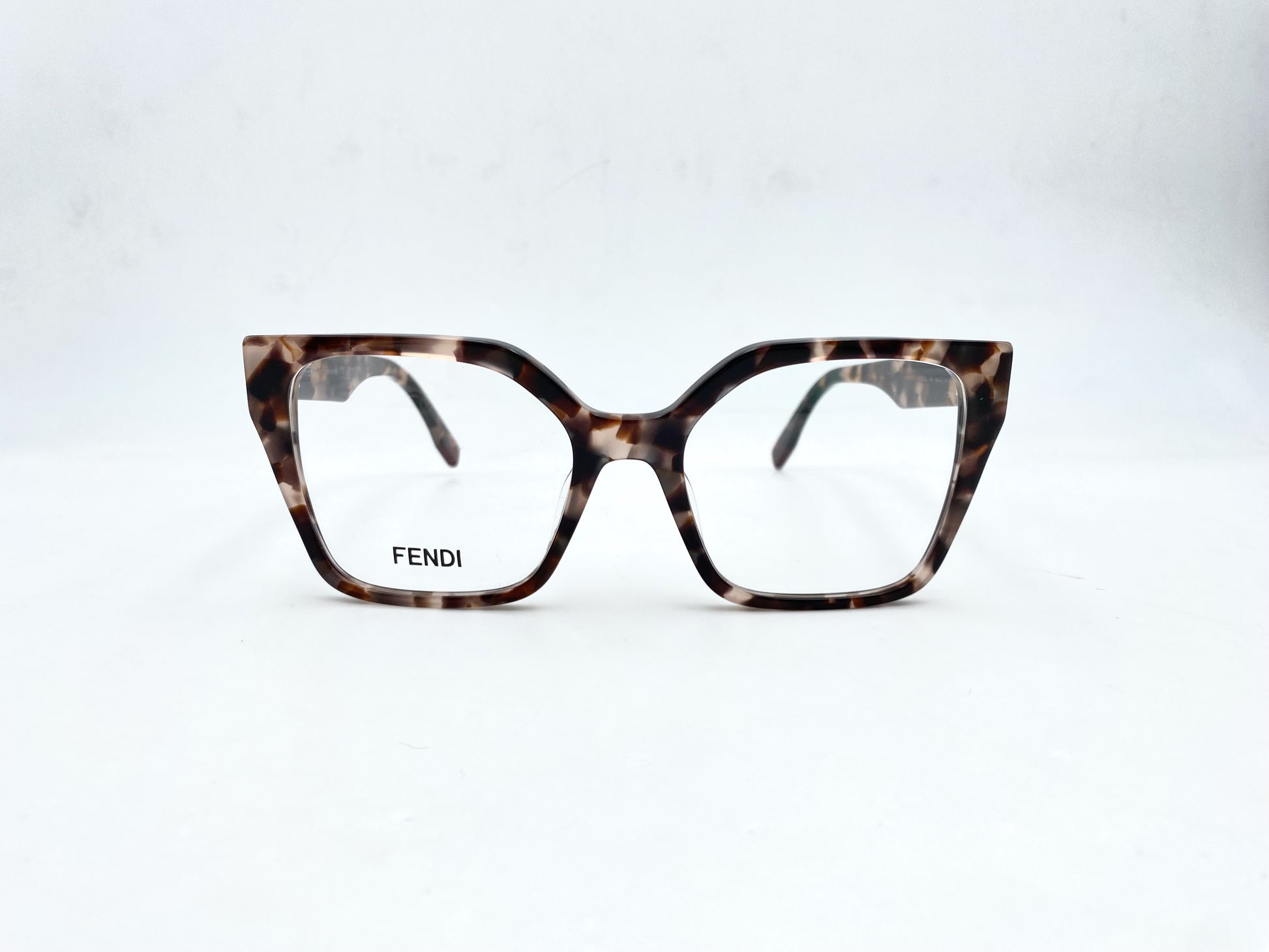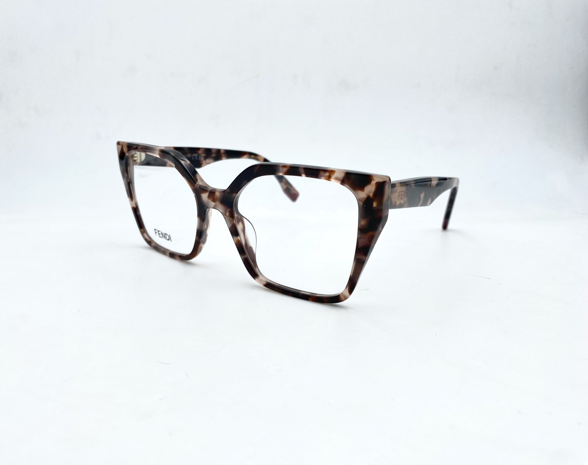 Montatura da vista Fendi tartarugato rosa/marrone. Frontale cat-eye e aste leggere con nome del brand.