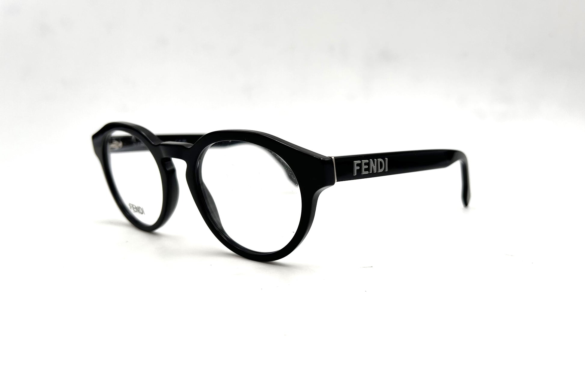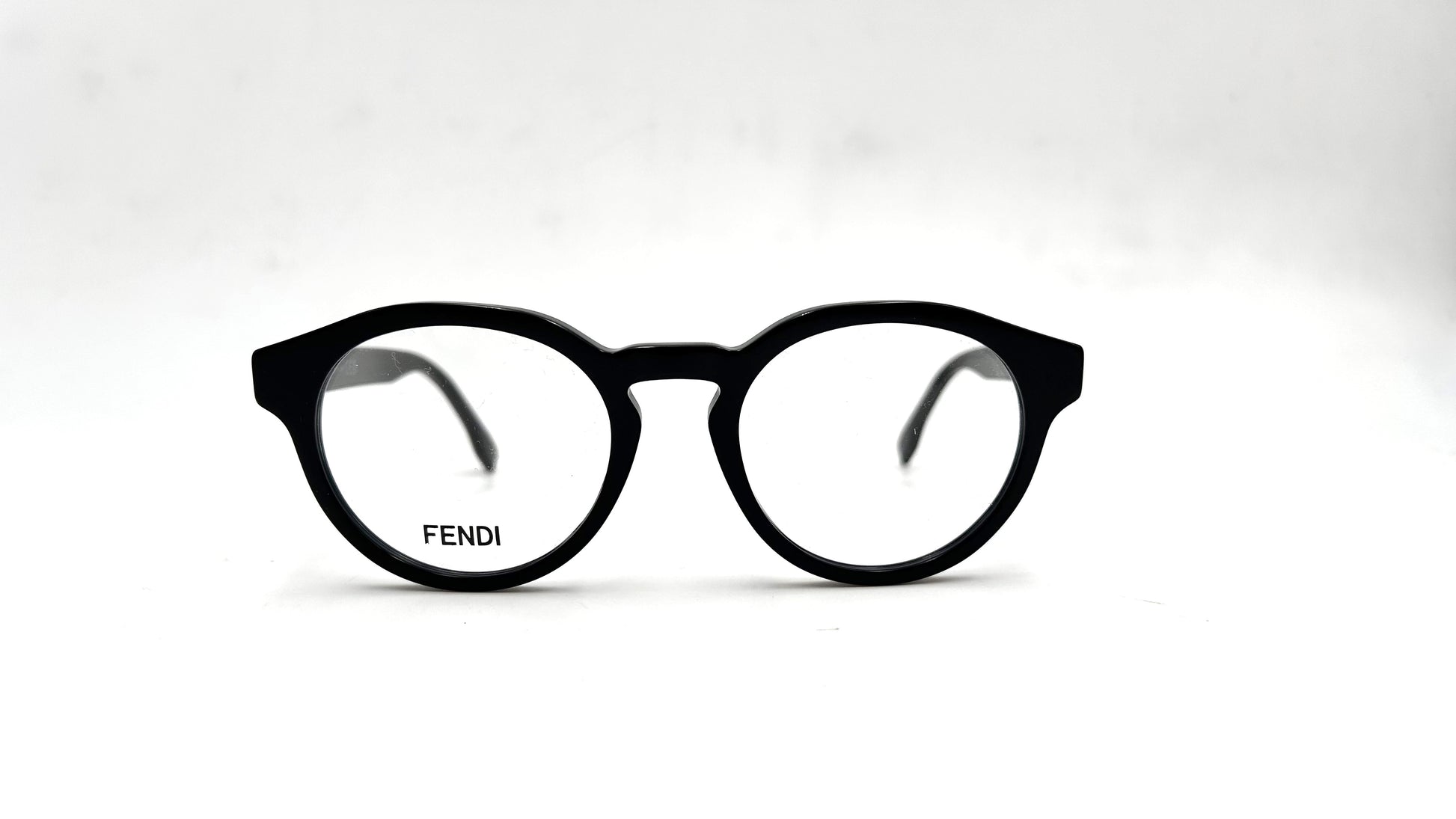 Montatura da vista Fendi in acetato nero lucido. Frontale tondo e ponte a chiave. Aste con nome del brand.