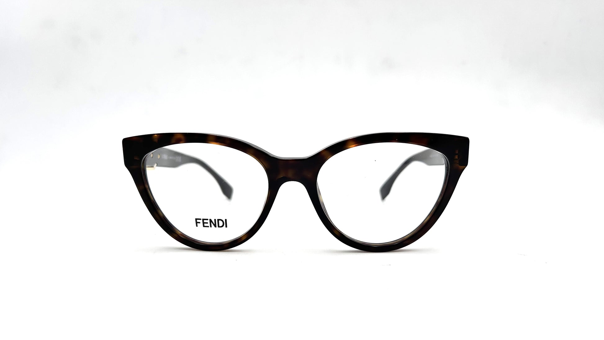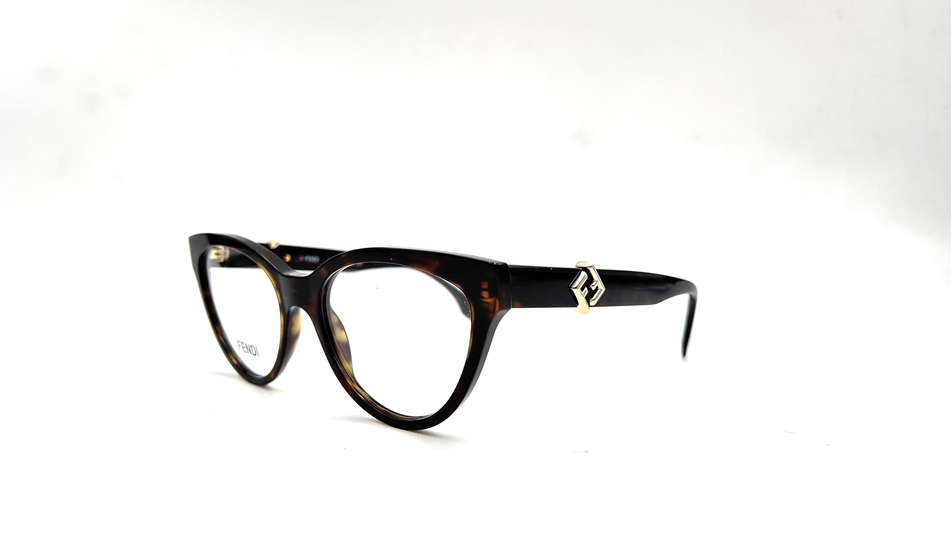 Montatura da vista Fendi in acetato tartarugato. Frontale cat-eye e aste con logo a rombo in metallo oro.