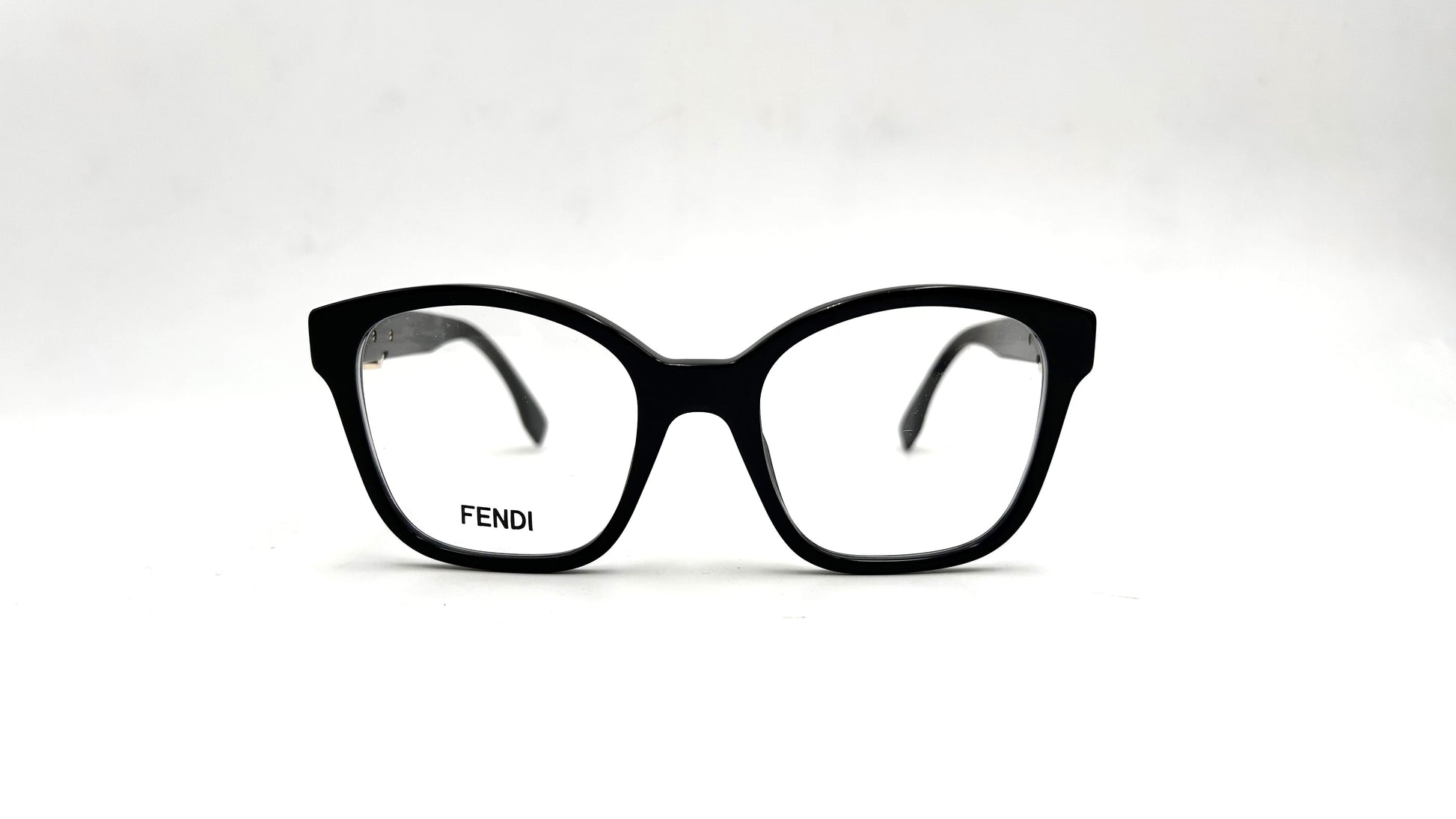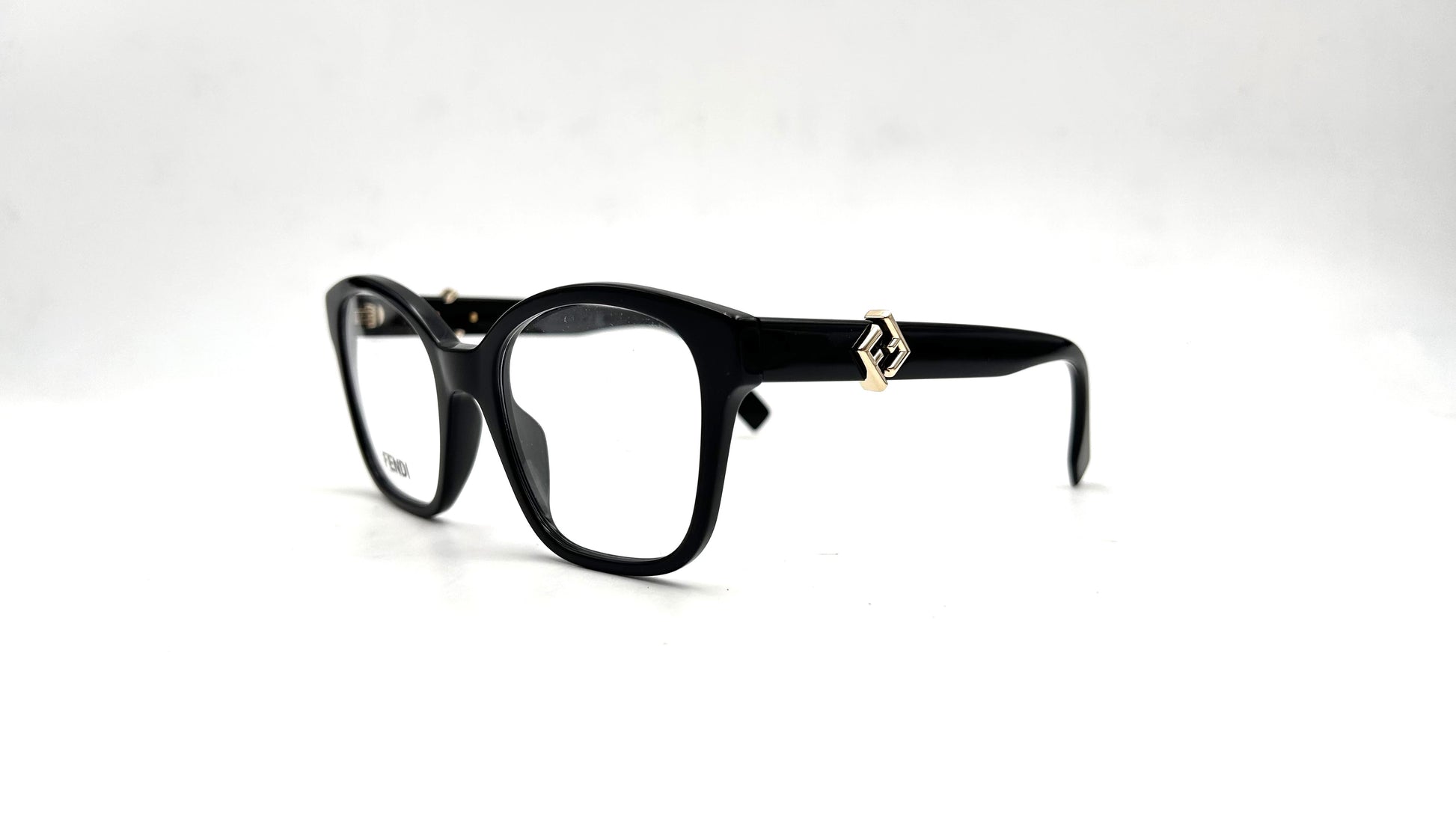 Montatura da vista Fendi in acetato nero lucido. Frontale cat-eye e aste leggere con logo a rombo in metallo oro.