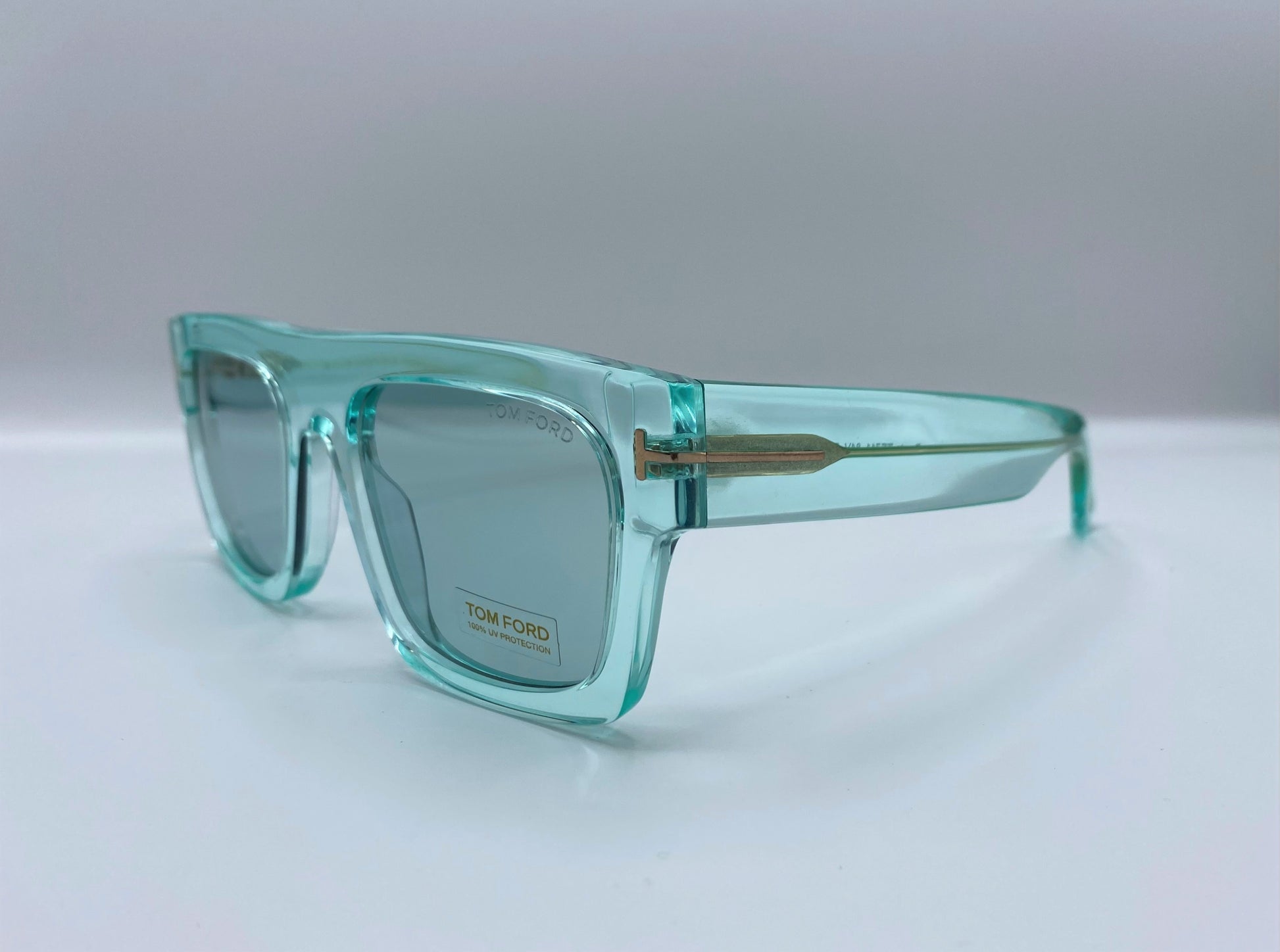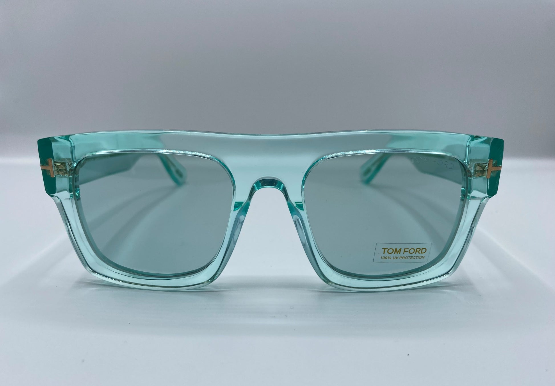 Occhiale da sole in acetato Tom Ford. Frontale ampio squadrato e lineare. Montatura spessa verde acqua trasparente. Aste robuste e confortevoli con punto luce in metallo sulle aste che finisce sul frontale tipico marchio del brand. Comodo ponte classico e naselli acetati.