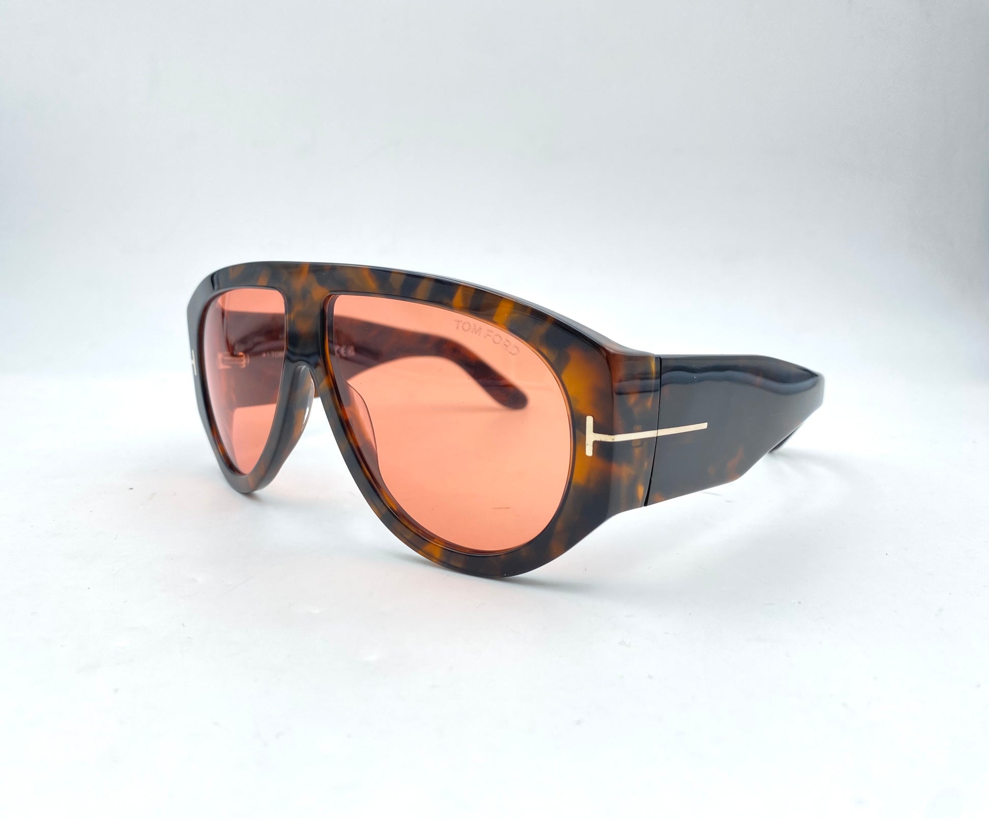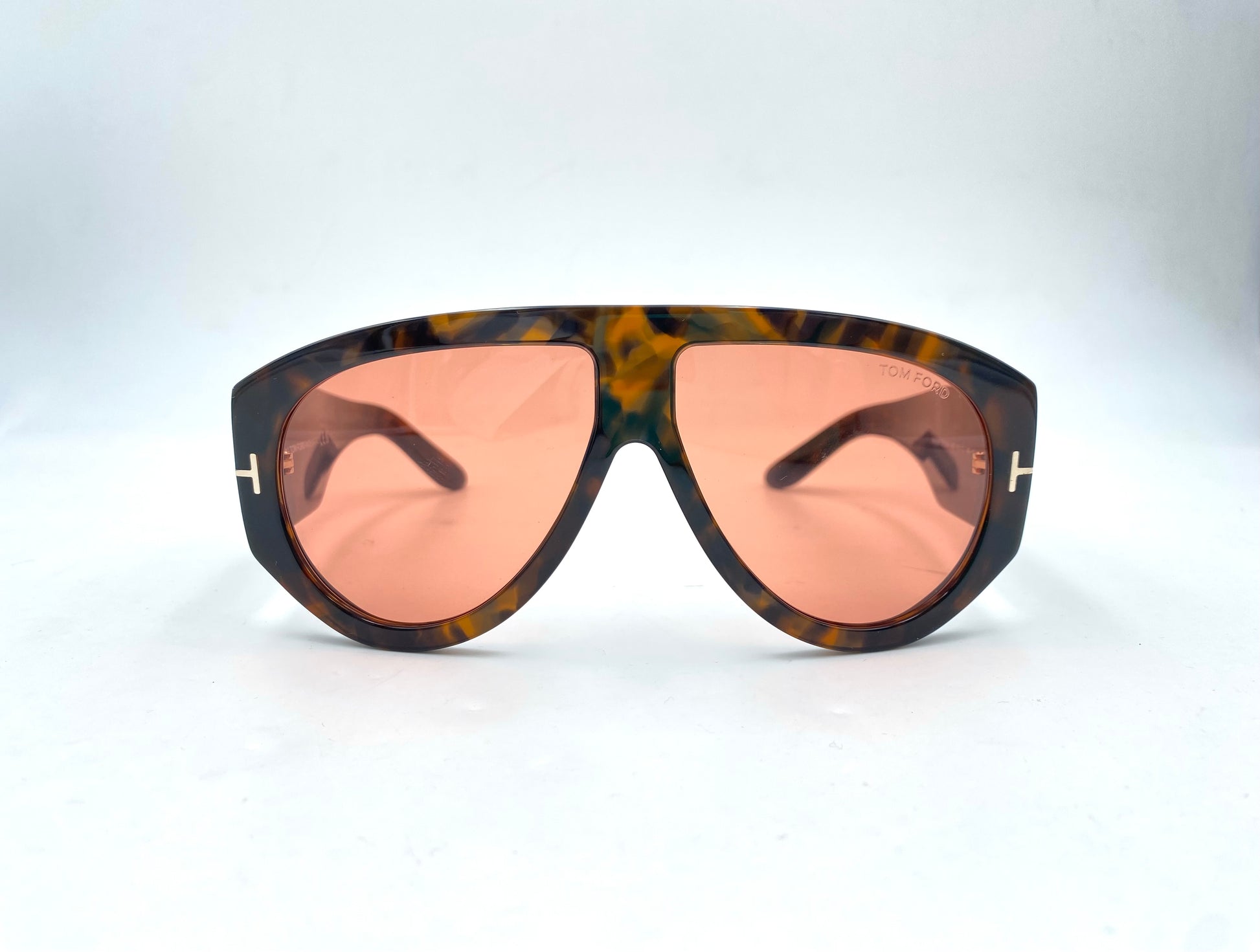 Occhiale da sole Tom Ford in acetato tartarugato lucido. Montatura ultra spessa e frontale ampio stile aviator. Lenti rosa e aste con logo.