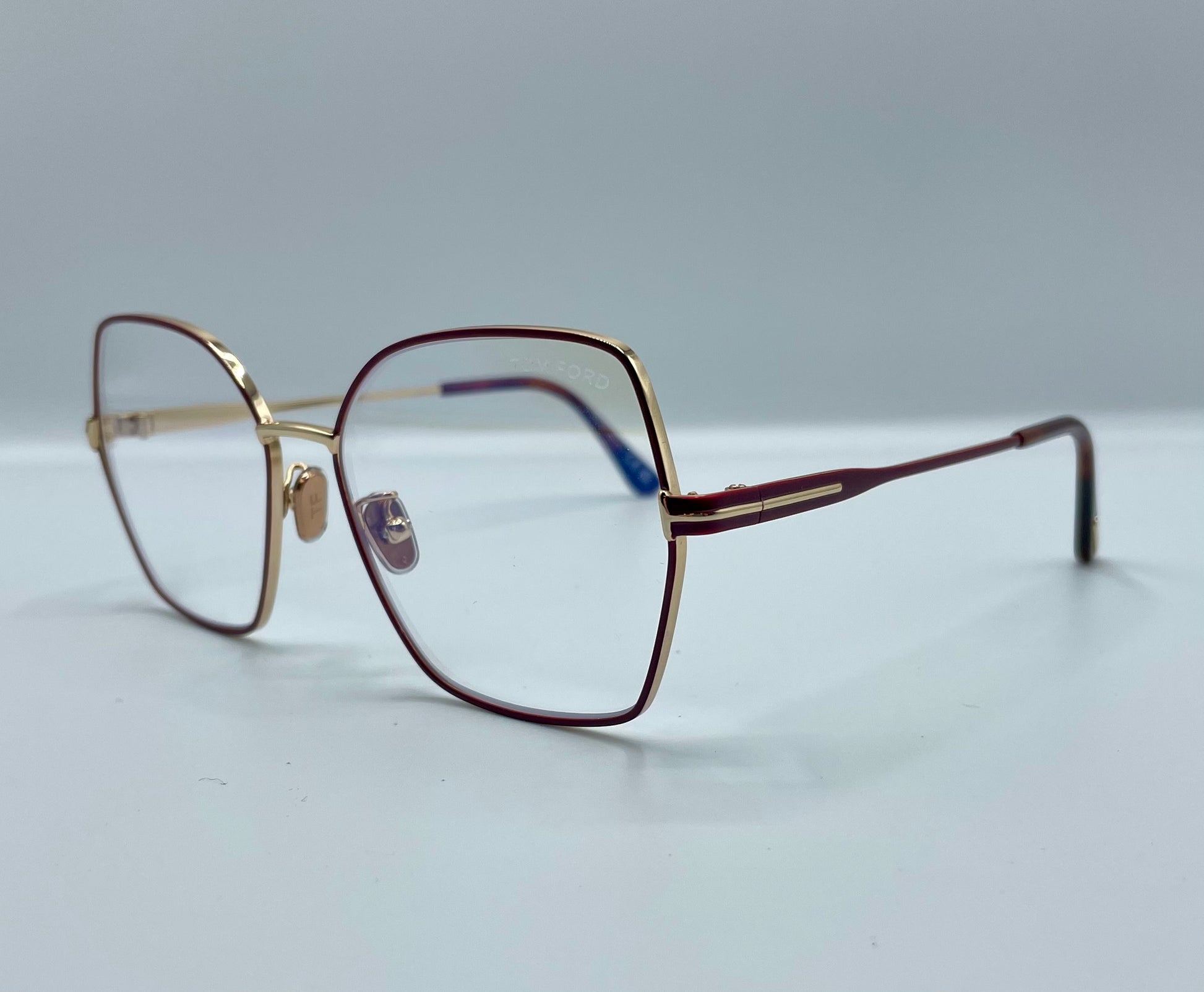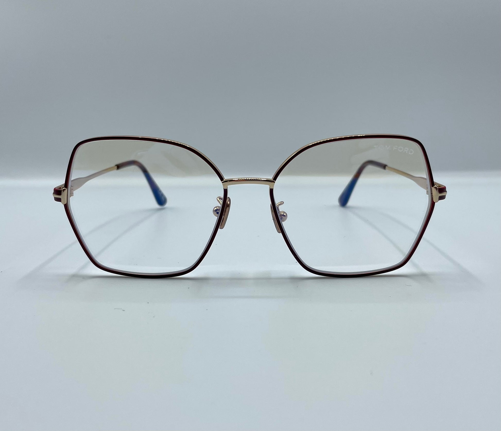 Occhiale da vista donna firmato Tom Ford in metallo. Frontale squadrato con forma esagonale di color rosso e rifiniture dorate. Aste leggere e confortevoli in metallo con terminali in celluloide havana. Comodi naselli regolabili.