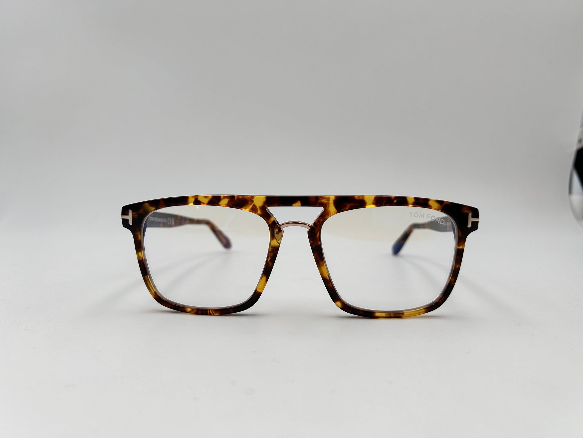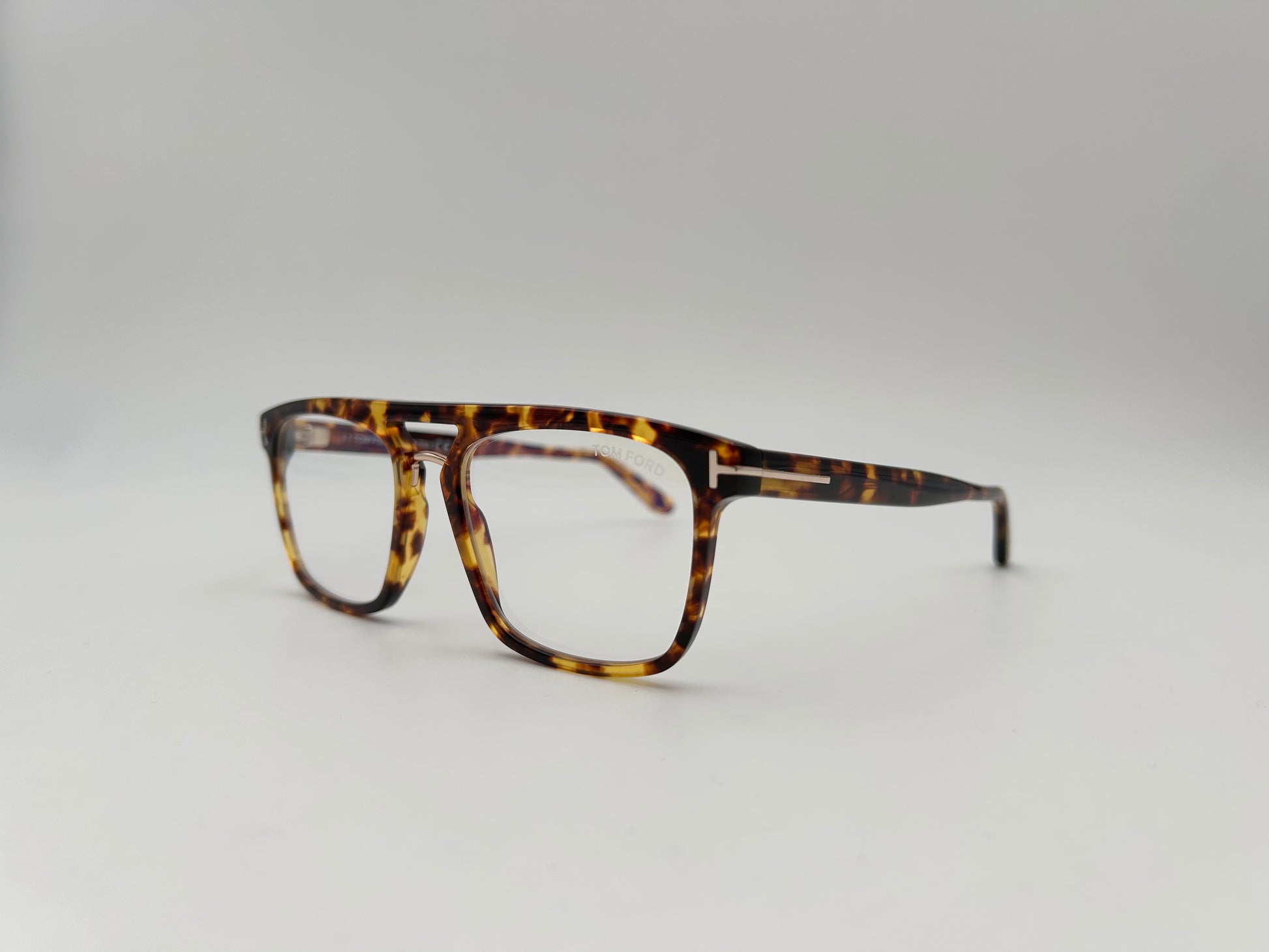 Occhiale da vista firmato Tom Ford in acetato. Frontale rettangolare color havana chiaro con doppio ponte. Aste leggere e confortevoli con tipico logo del brand in oro. Comodi naselli acetati.