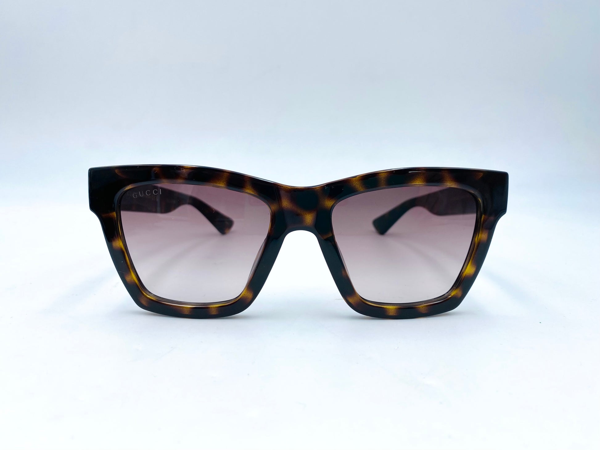 Occhiale da sole Gucci in acetato tartarugato lucido. Frontale cat-eye e lente marrone sfumata. Aste con logo oro.