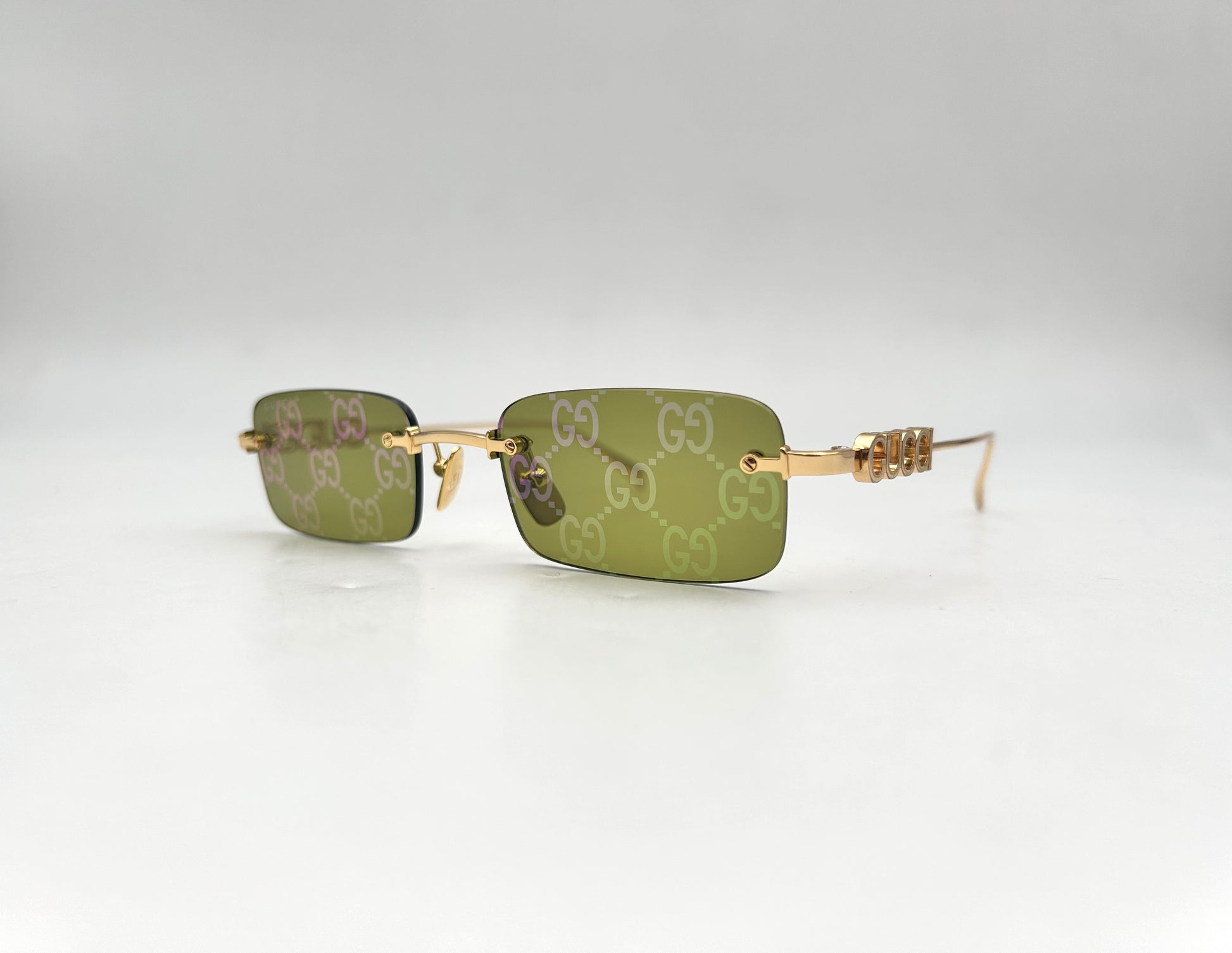 Occhiale da sole Gucci in metallo oro. Frontale glasant ultra stretto con lenti verdi logate olografiche. Aste con nome del brand e naselli in metallo.