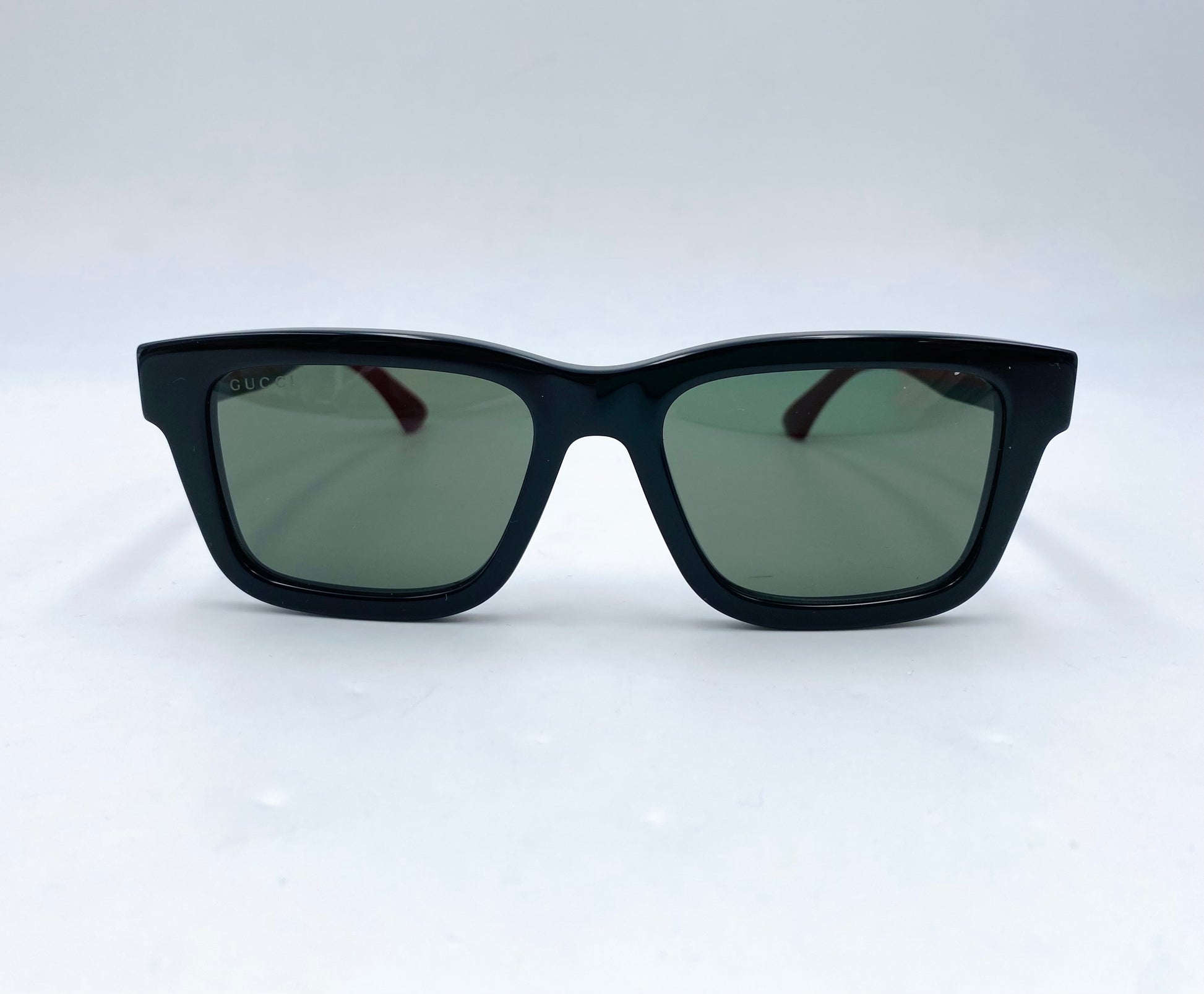 Occhiale da sole Gucci. Frontale squadrato in acetato nero e lenti verdi. Aste leggere verdi e rosse con nome del brand oro.