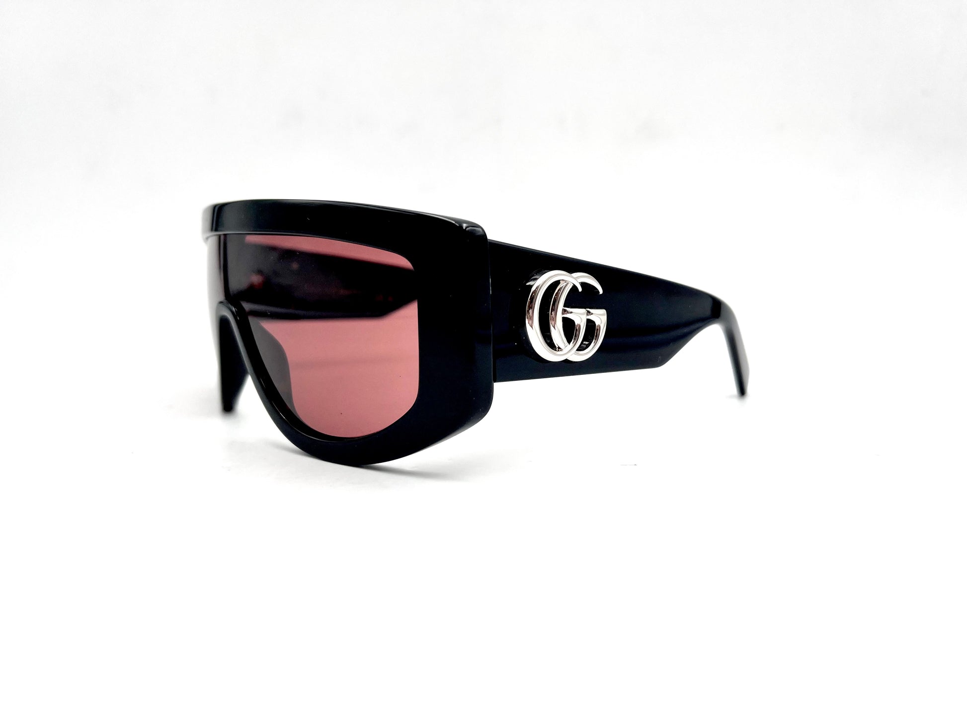 Mascherina da sole Gucci. Frontale con lente unica rosa e montatura spessa in acetato nero lucido. Aste con logo del brand in metallo argento.