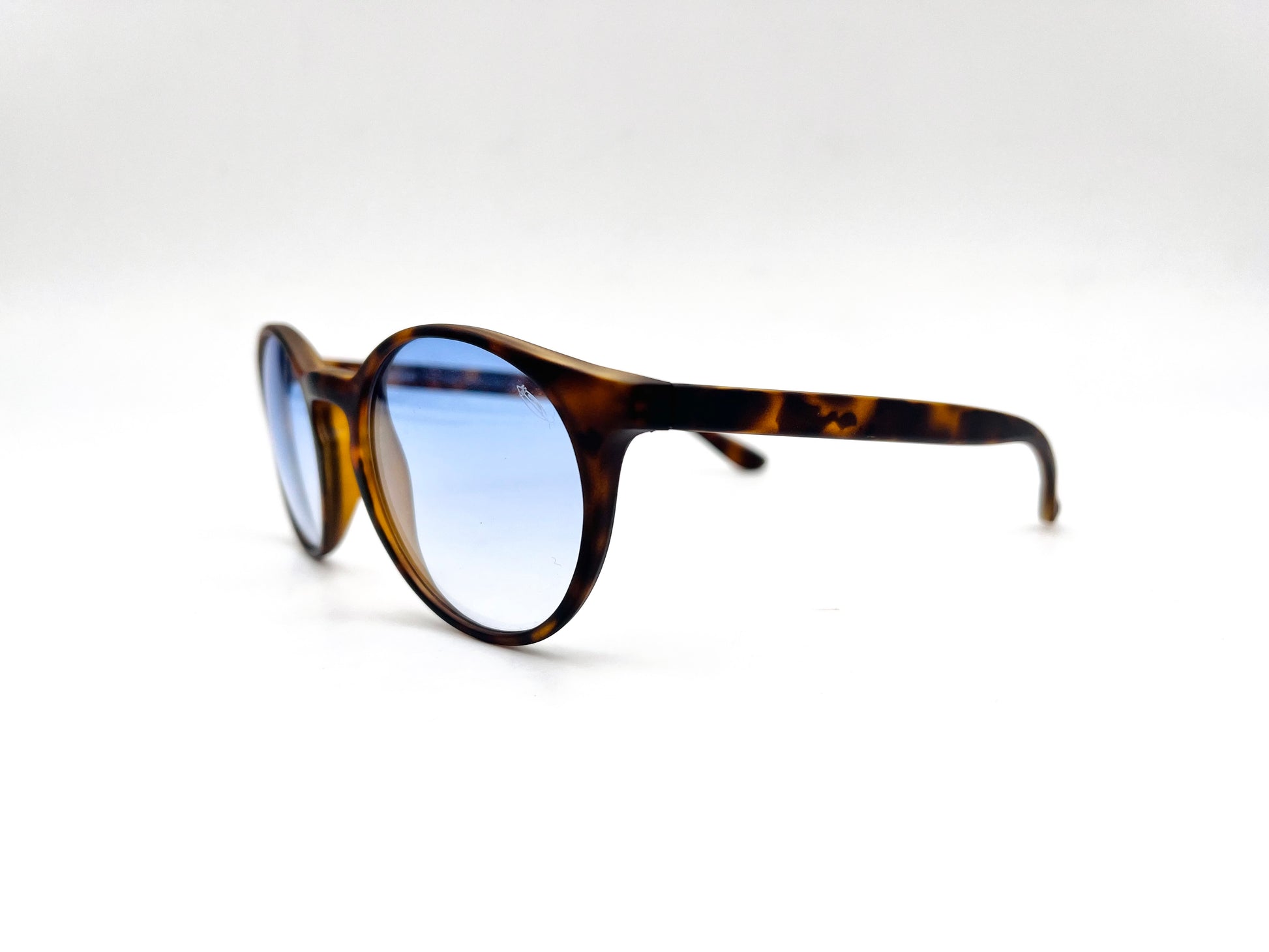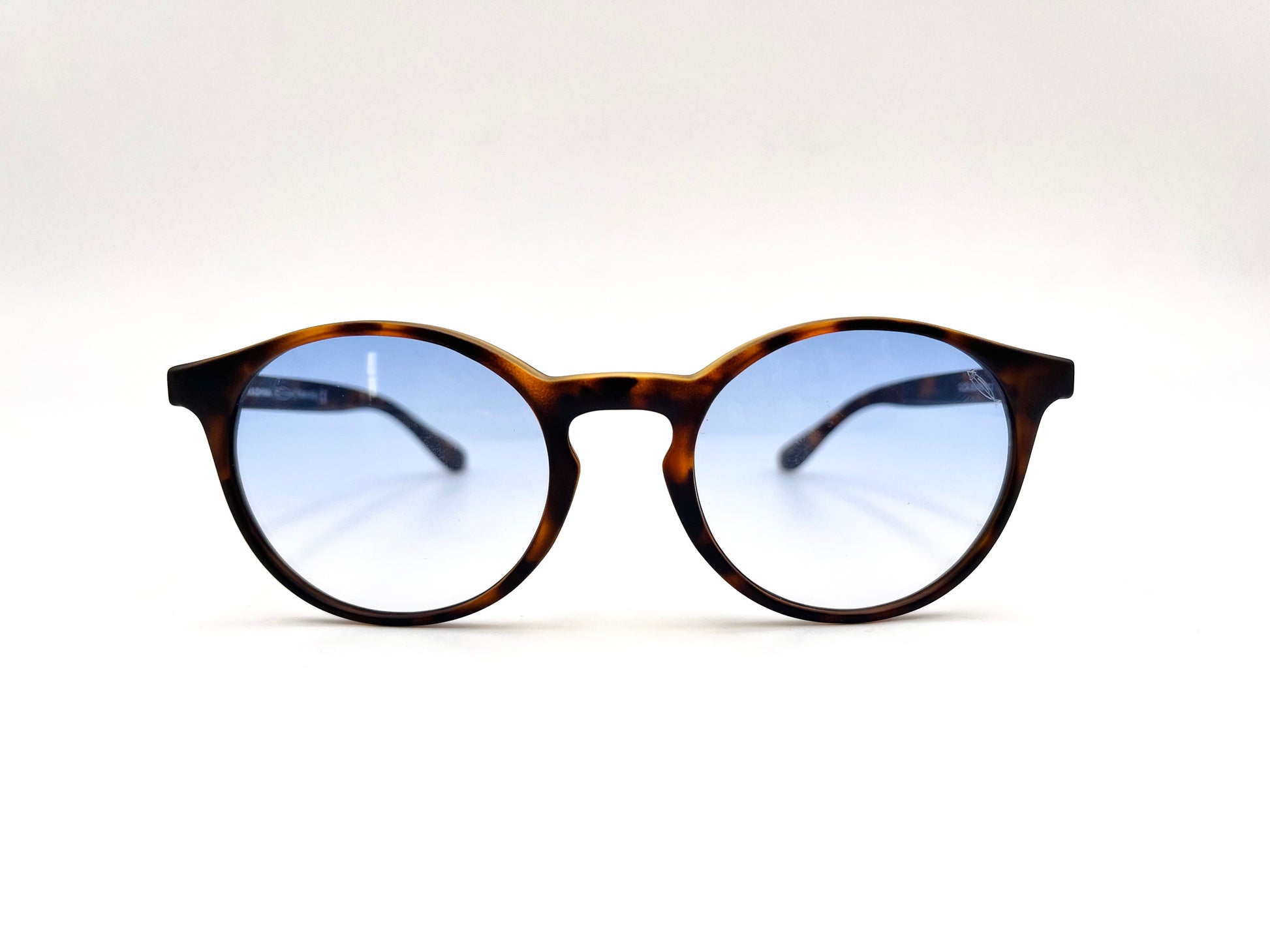 Occhiale da sole Saraghina in acetato tartarugato opaco. Frontale tondo con lenti azzurre chiare sfumate.