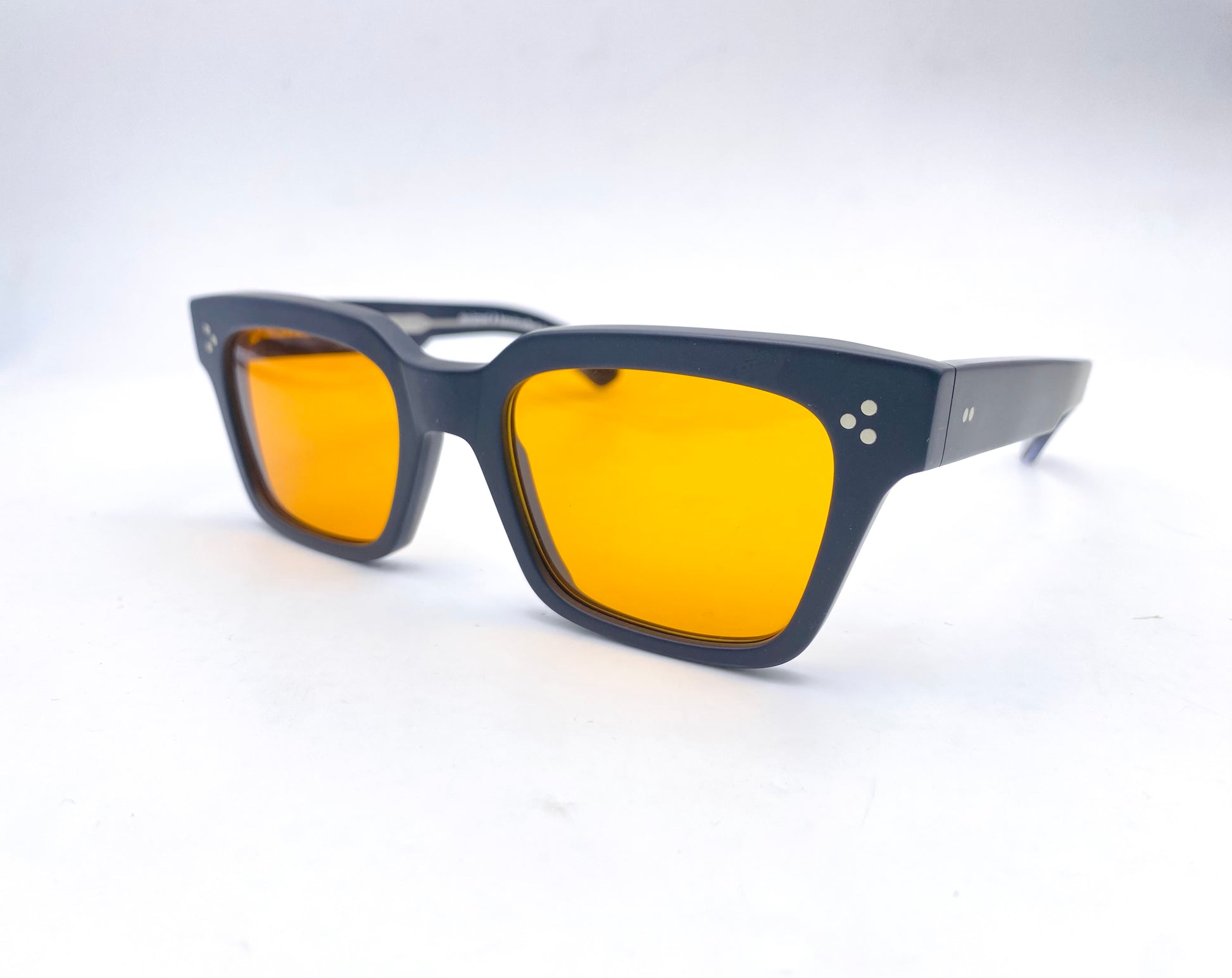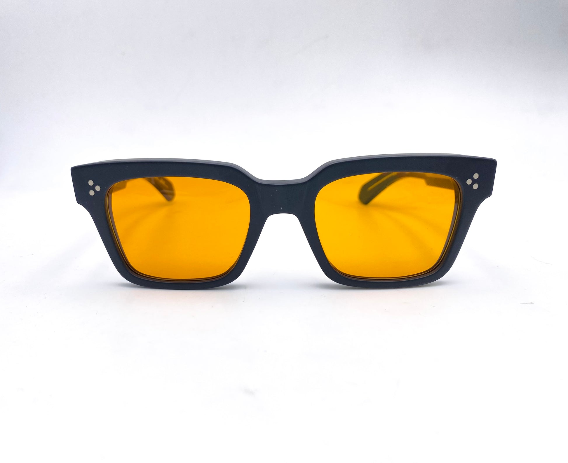 Occhiale da sole Kàdor in acetato nero lucido. Frontale squadrato con lenti arancioni e punti luce laterali. Aste con trama argento.