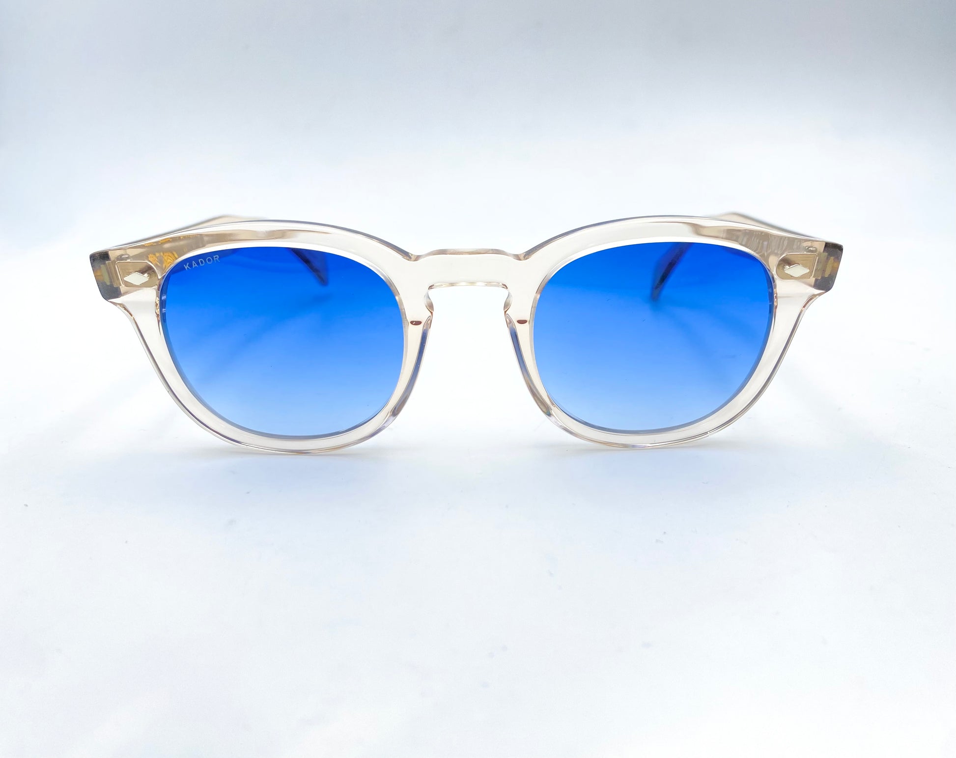 Occhiale da sole firmato Kàdor in acetato color champagne lucido. Frontale phantos e lenti azzurro sfumato. Comode aste e naselli in acetato.