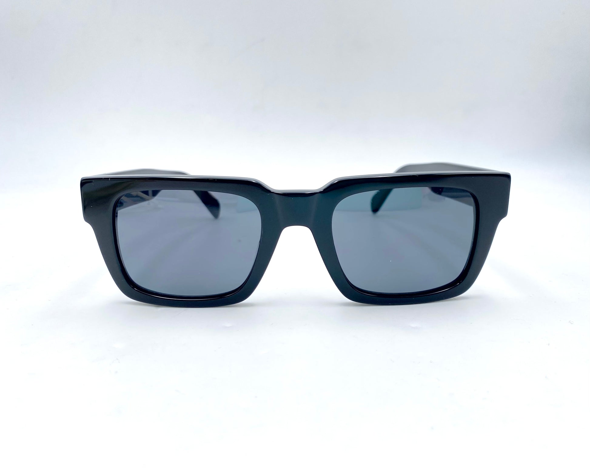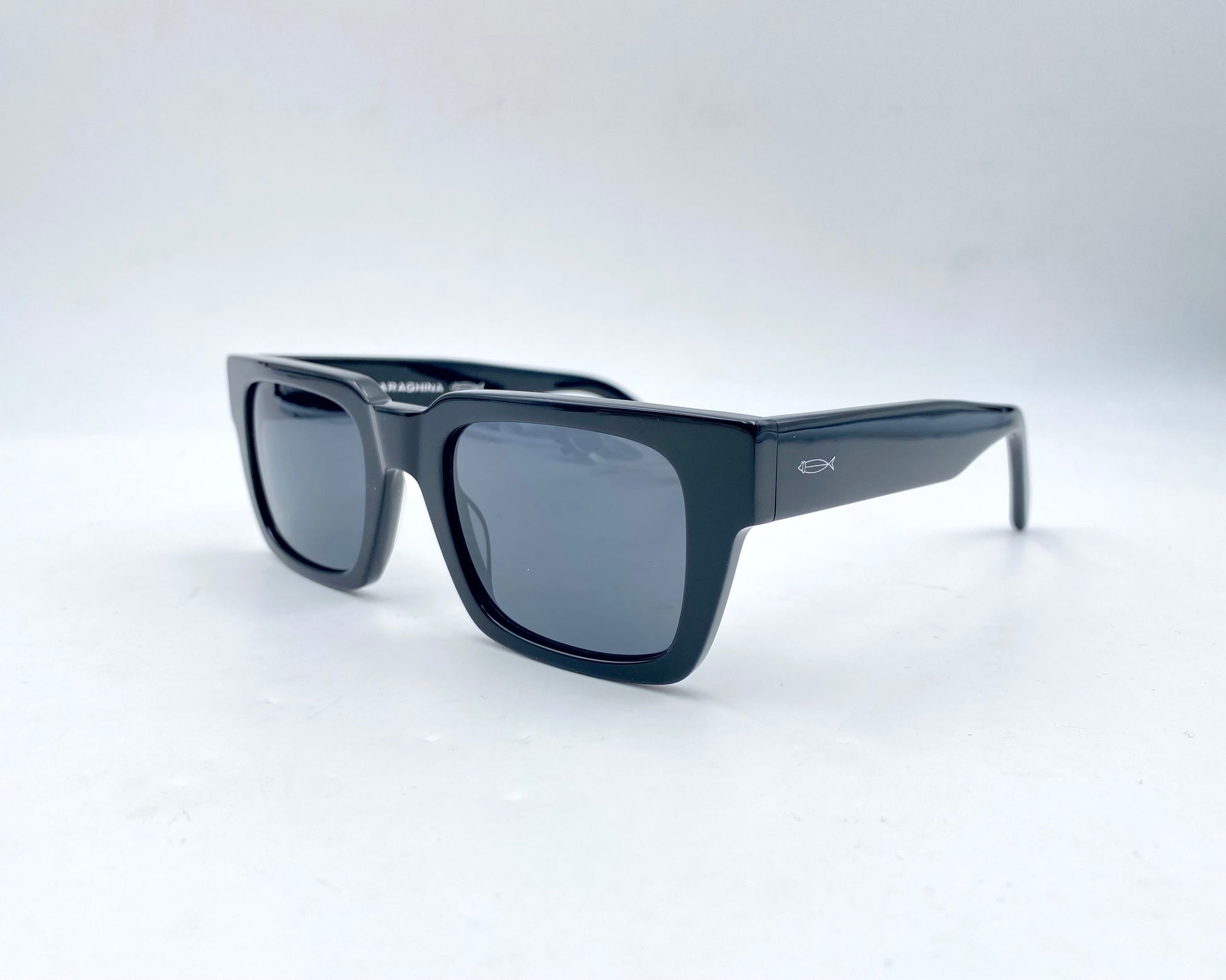 Occhiale da sole Saraghina in acetato nero lucido. Frontale squadrato stretto. Asta con logo del brand e lenti grigio fumo.