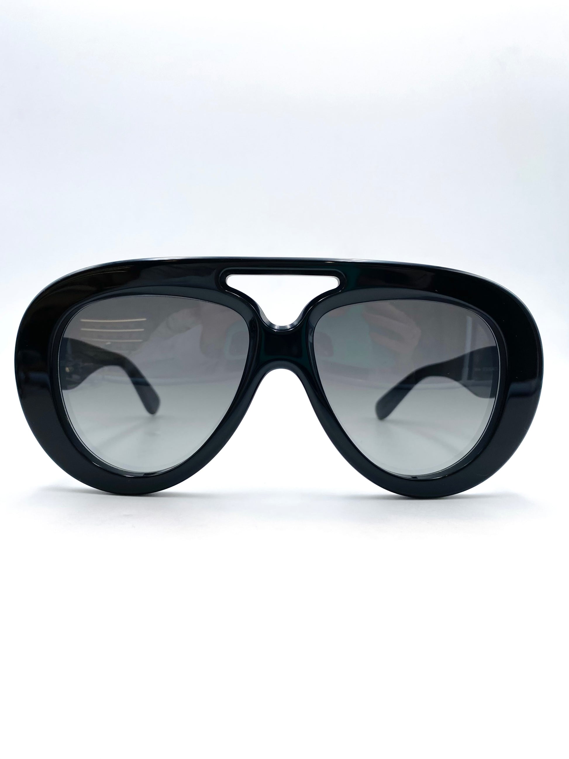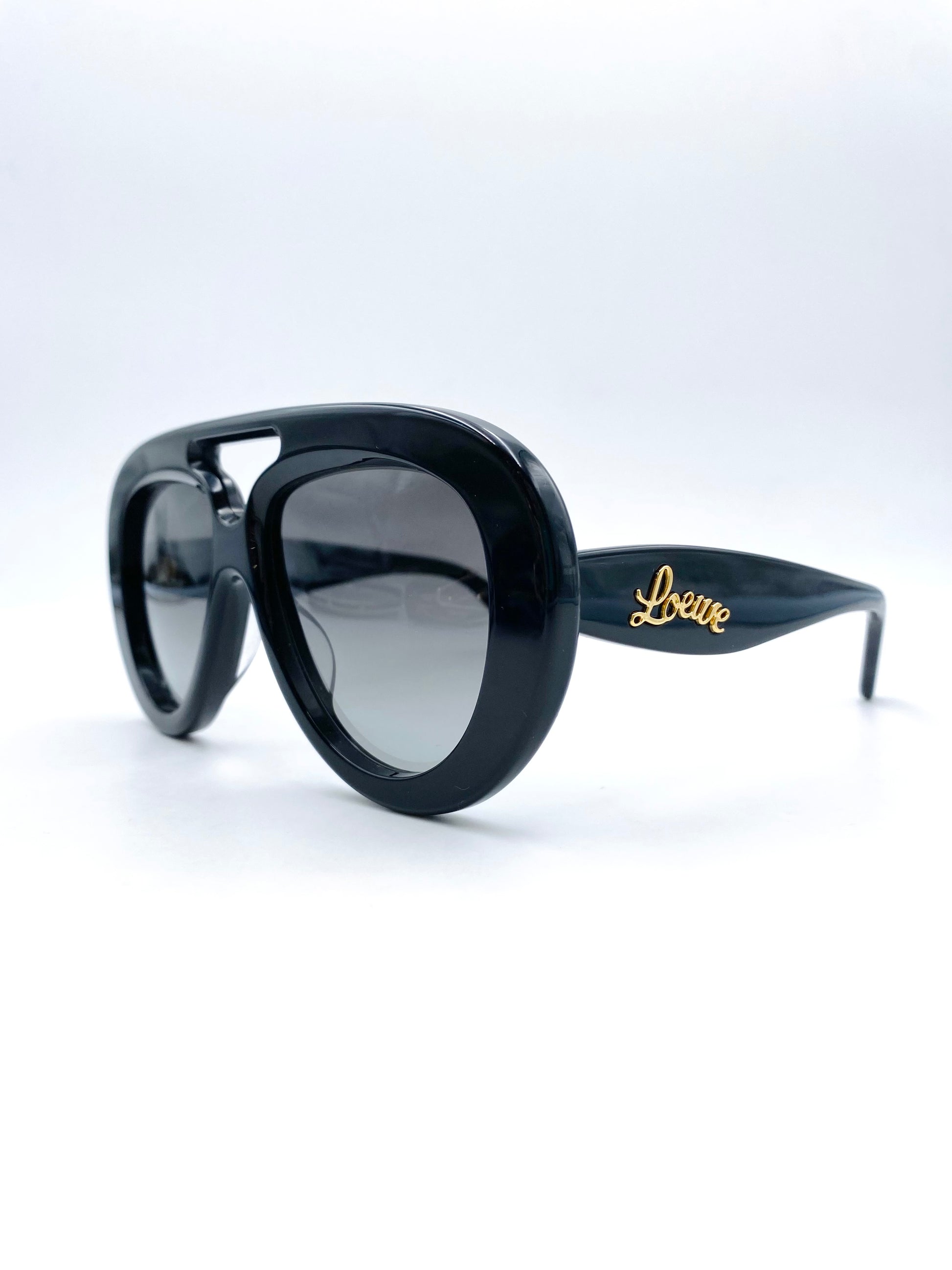 Occhiale da sole Loewe in acetato nero lucido. Frontale ultra ampio stile aviator con doppio ponte. Montatura spessa e lenti grigio fumo con leggera sfumatura. Aste con nome del brand oro.