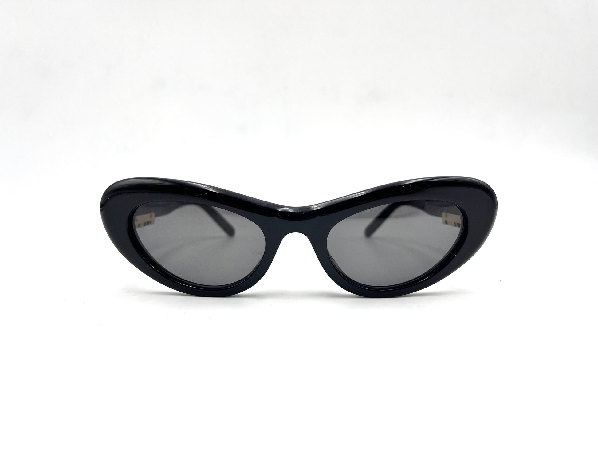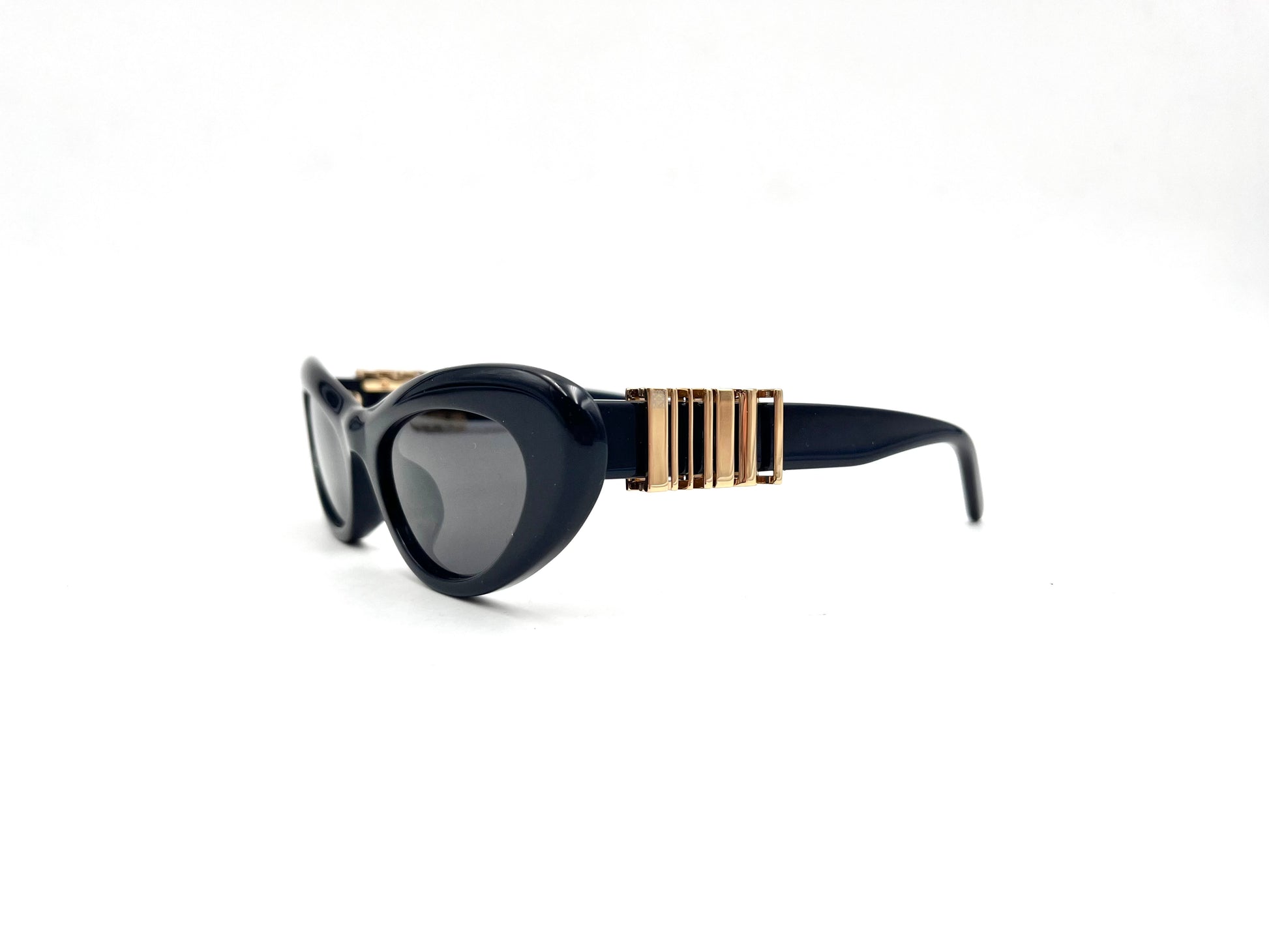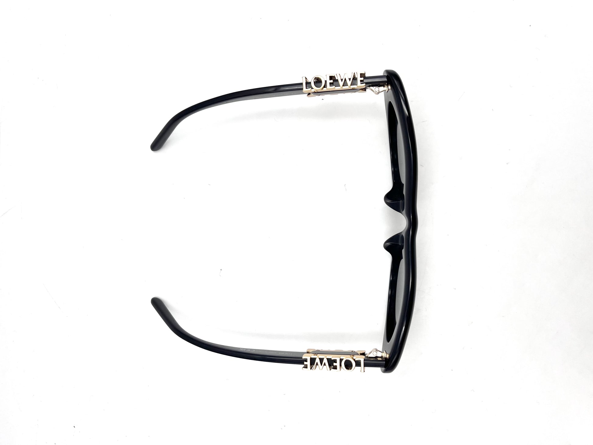 Occhiale da sole Loewe in acetato nero lucido. Frontale stretto cat-eye con lenti grigio fumo a aste con logo in metallo oro effetto codice a barre.