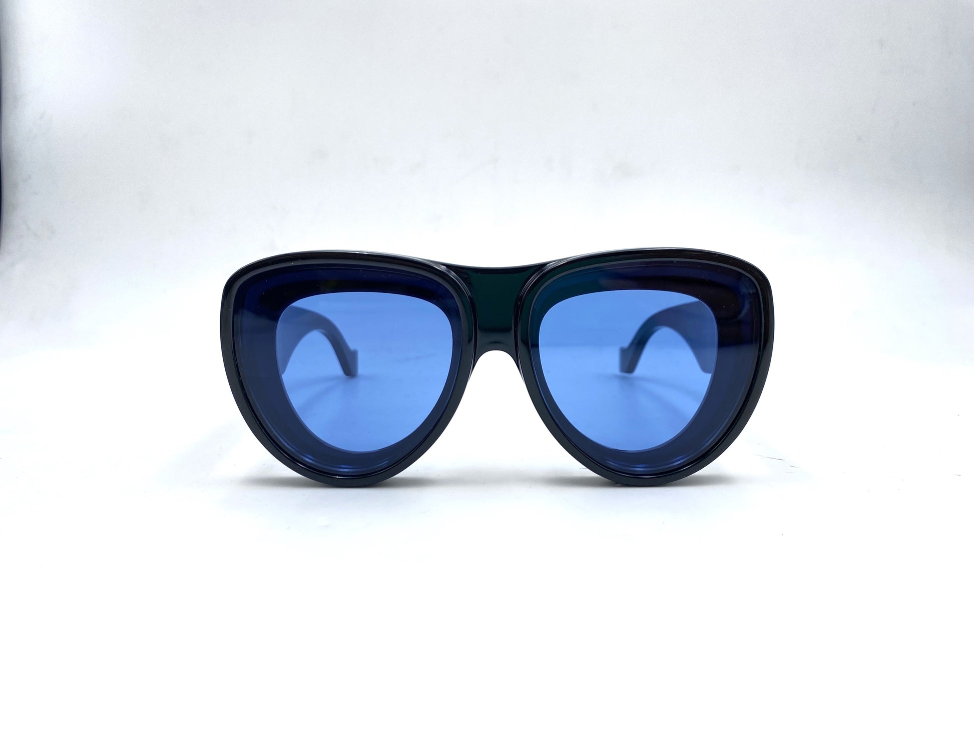 Occhiale da sole Loewe in acetato nero lucido. Montatura ultra spessa e lenti azzurre. Aste con nome del brand e logo ai terminali color oro.